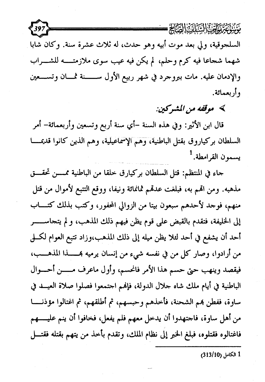 قال ابن الأثير: وفي هذه السنة -أي سنة أربع وتسعين وأربعمائة- أمر السلطان بركياروق بقتل الباطنية، وهم الإسماعيلية، وهم الذين كانوا قديما يسمون القرامطة. (¬1)
