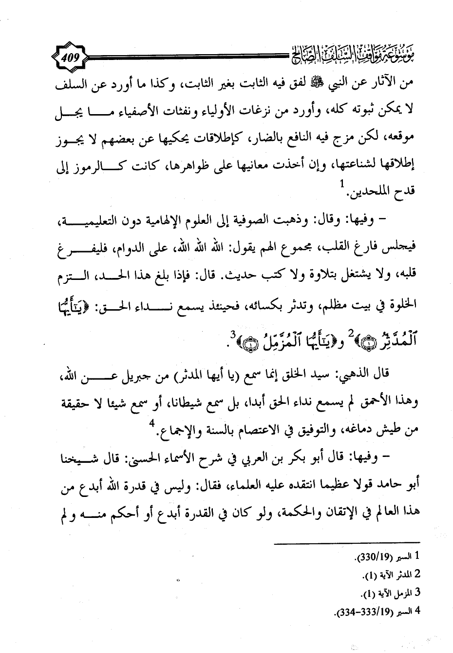 قال الذهبي: سيد الخلق إنما سمع (يا أيها المدثر) من جبريل عن الله، وهذا الأحمق لم يسمع نداء الحق أبدا، بل سمع شيطانا، أو سمع شيئا لا حقيقة من طيش دماغه، والتوفيق في الاعتصام بالسنة والإجماع. (¬4)