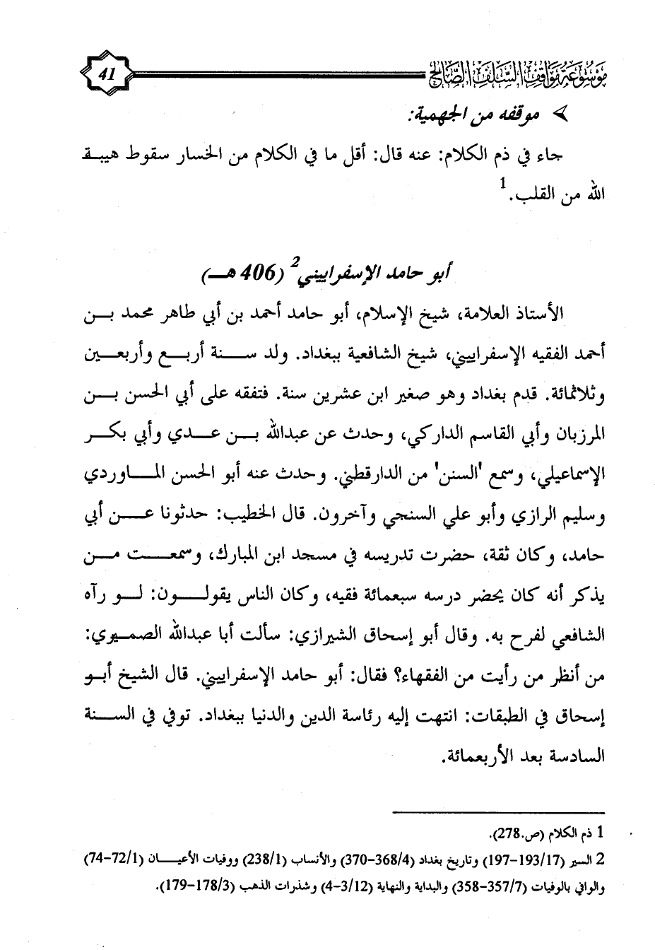 الأستاذ العلامة، شيخ الإسلام، أبو حامد أحمد بن أبي طاهر محمد بن أحمد الفقيه الإسفراييني، شيخ الشافعية ببغداد. ولد سنة أربع وأربعين وثلاثمائة. قدم بغداد وهو صغير ابن عشرين سنة. فتفقه على أبي الحسن بن المرزبان وأبي القاسم الداركي، وحدث عن عبد الله بن عدي وأبي بكر الإسماعيلي، وسمع 'السنن' من الدارقطني. وحدث عنه أبو الحسن الماوردي وسليم الرازي وأبو علي السنجي وآخرون. قال الخطيب: حدثونا عن أبي حامد، وكان ثقة، حضرت تدريسه في مسجد ابن المبارك، وسمعت من يذكر أنه كان يحضر درسه سبعمائة فقيه، وكان الناس يقولون: لو رآه الشافعي لفرح به. وقال أبو إسحاق الشيرازي: سألت أبا عبد الله الصميري: من أنظر من رأيت من الفقهاء؟ فقال: أبو حامد الإسفراييني. قال الشيخ أبو إسحاق في الطبقات: انتهت إليه رئاسة الدين والدنيا ببغداد. توفي في السنة السادسة بعد الأربعمائة.