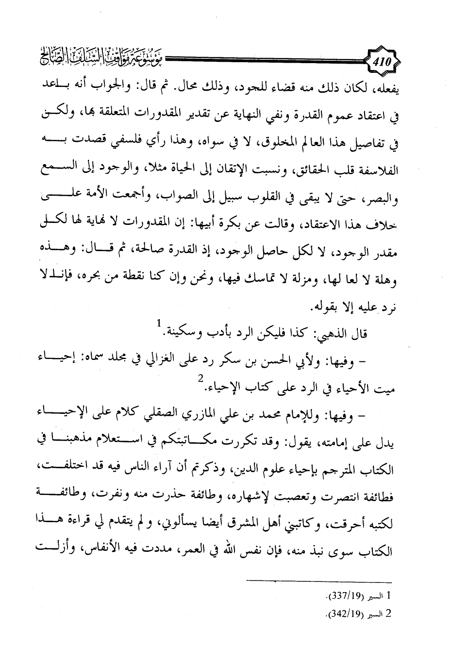 - وفيها: وللإمام محمد بن علي المازري الصقلي كلام على الإحياء يدل على إمامته، يقول: وقد تكررت مكاتبتكم في استعلام مذهبنا في الكتاب المترجم بإحياء علوم الدين، وذكرتم أن آراء الناس فيه قد اختلفت، فطائفة انتصرت وتعصبت لإشهاره، وطائفة حذرت منه ونفرت، وطائفة لكتبه أحرقت، وكاتبني أهل المشرق أيضا يسألوني، ولم يتقدم لي قراءة هذا الكتاب سوى نبذ منه، فإن نفس الله في العمر، مددت فيه الأنفاس، وأزلت