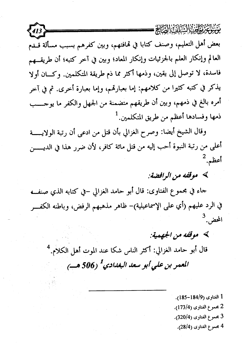 جاء في مجموع الفتاوى: قال أبو حامد الغزالي -في كتابه الذي صنفه في الرد عليهم (أي على الإسماعيلية) - ظاهر مذهبهم الرفض، وباطنه الكفر المحض. (¬3)