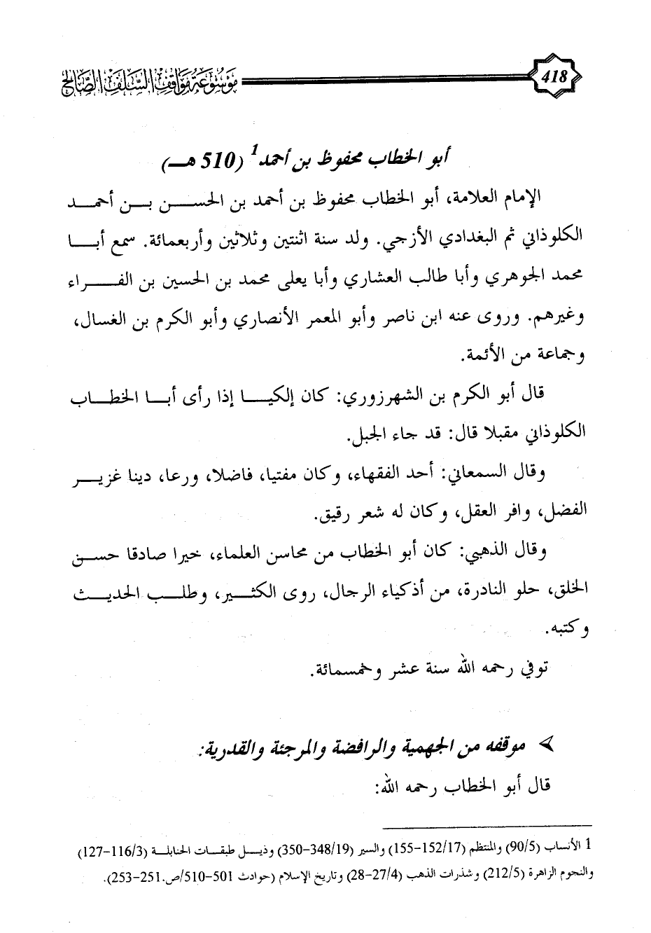 الإمام العلامة، أبو الخطاب محفوظ بن أحمد بن الحسن بن أحمد الكلوذاني ثم البغدادي الأزجي. ولد سنة اثنتين وثلاثين وأربعمائة. سمع أبا محمد الجوهري وأبا طالب العشاري وأبا يعلى محمد بن الحسين بن الفراء وغيرهم. وروى عنه ابن ناصر وأبو المعمر الأنصاري وأبو الكرم بن الغسال، وجماعة من الأئمة.