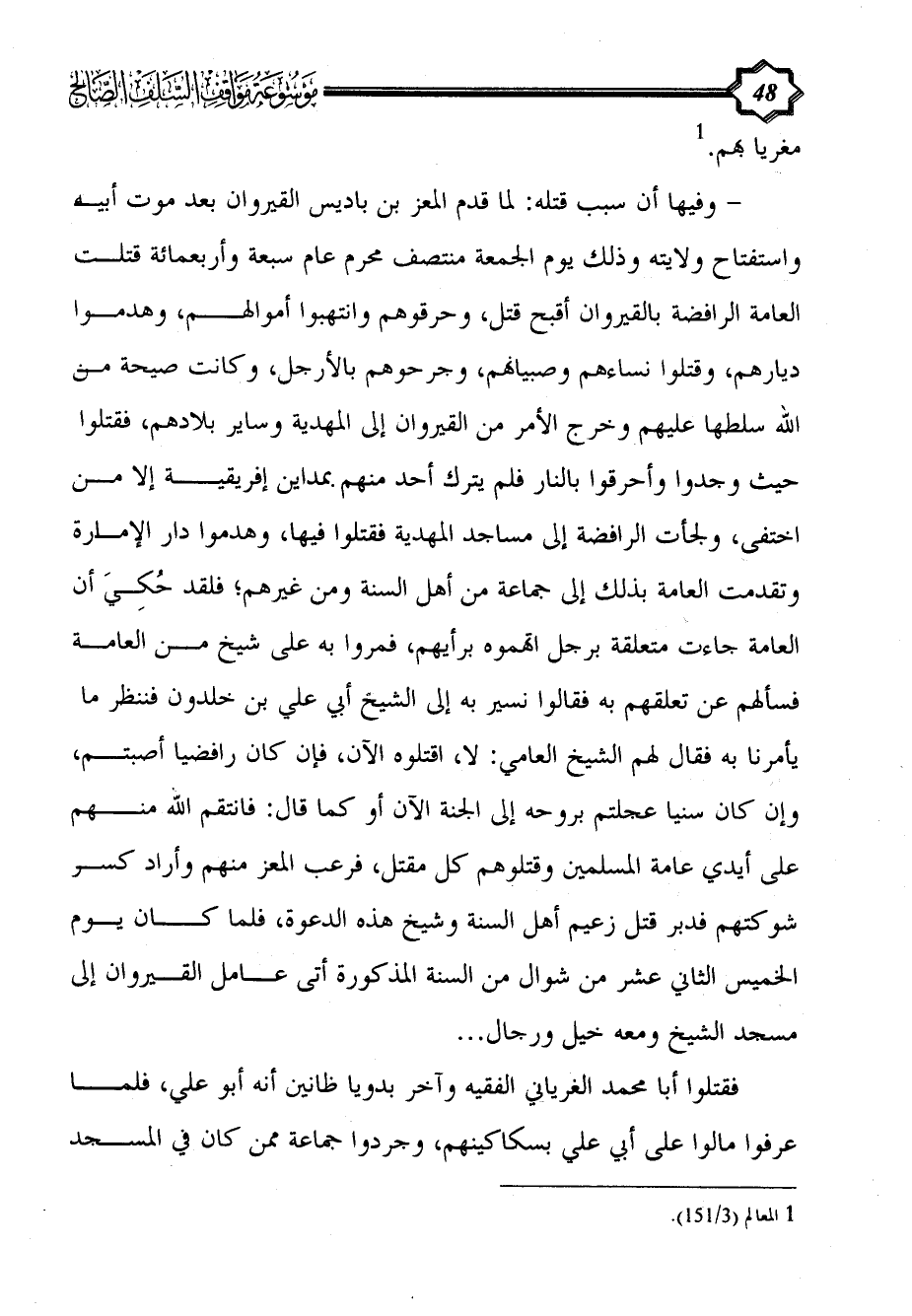 - وفيها أن سبب قتله: لما قدم المعز بن باديس القيروان بعد موت أبيه واستفتاح ولايته وذلك يوم الجمعة منتصف محرم عام سبعة وأربعمائة قتلت العامة الرافضة بالقيروان أقبح قتل، وحرقوهم وانتهبوا أموالهم، وهدموا ديارهم، وقتلوا نساءهم وصبيانهم، وجرحوهم بالأرجل، وكانت صيحة من الله سلطها عليهم وخرج الأمر من القيروان إلى المهدية وساير بلادهم، فقتلوا حيث وجدوا وأحرقوا بالنار فلم يترك أحد منهم بمداين إفريقية إلا من اختفى، ولجأت الرافضة إلى مساجد المهدية فقتلوا فيها، وهدموا دار الإمارة وتقدمت العامة بذلك إلى جماعة من أهل السنة ومن غيرهم؛ فلقد حُكِيَ أن العامة جاءت متعلقة برجل اتهموه برأيهم، فمروا به على شيخ من العامة فسألهم عن تعلقهم به فقالوا نسير به إلى الشيخ أبي علي بن خلدون فننظر ما يأمرنا به فقال لهم الشيخ العامي: لا، اقتلوه الآن، فإن كان رافضيا أصبتم، وإن كان سنيا عجلتم بروحه إلى الجنة الآن أو كما قال: فانتقم الله منهم على أيدي عامة المسلمين وقتلوهم كل مقتل، فرعب المعز منهم وأراد كسر شوكتهم فدبر قتل زعيم أهل السنة وشيخ هذه الدعوة، فلما كان يوم الخميس الثاني عشر من شوال من السنة المذكورة أتى عامل القيروان إلى مسجد الشيخ ومعه خيل ورجال ...