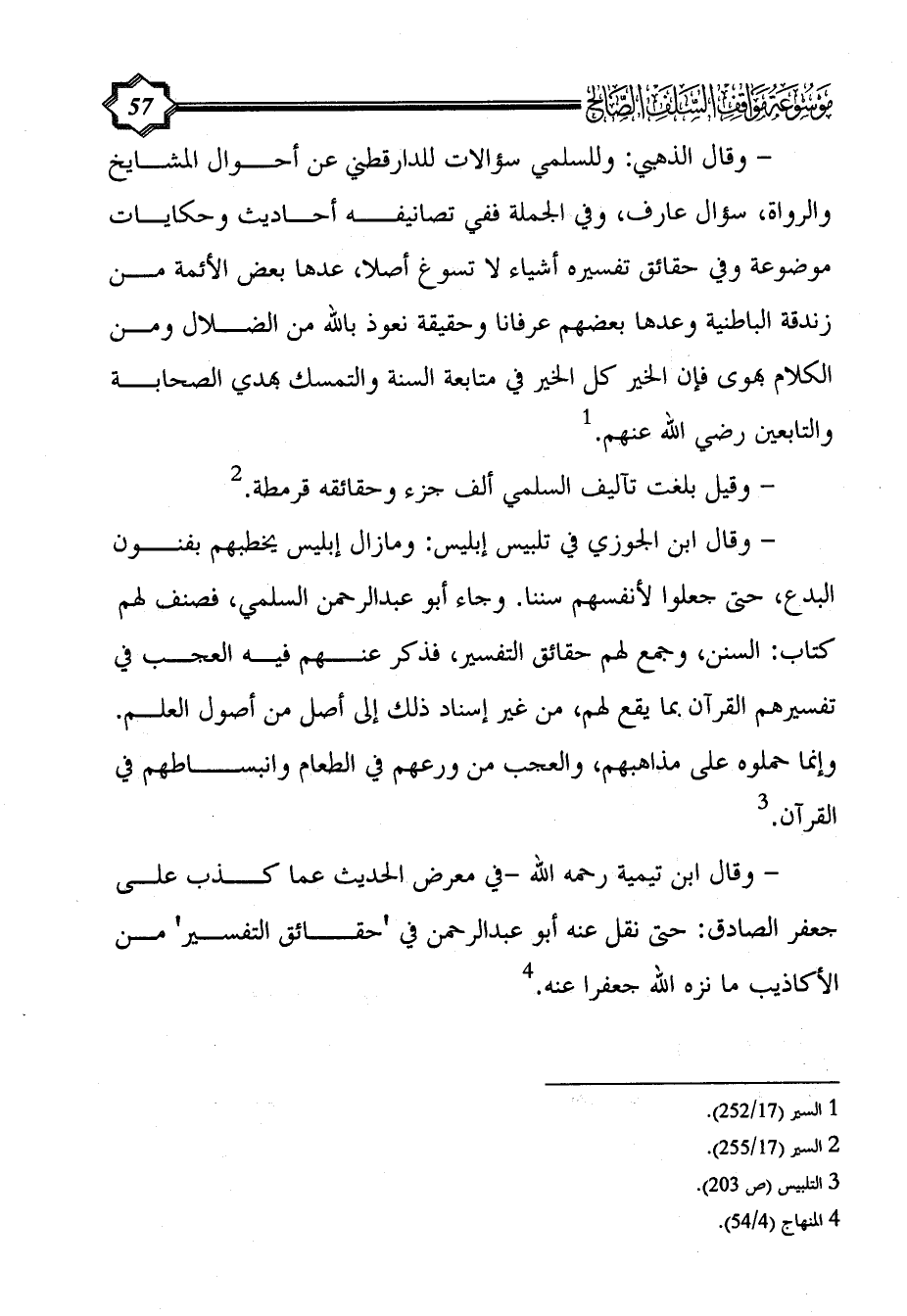 - وقال ابن تيمية رحمه الله -في معرض الحديث عما كُذِب على جعفر الصادق: حتى نقل عنه أبو عبد الرحمن في 'حقائق التفسير' من الأكاذيب ما نزه الله جعفرا عنه. (¬4)
