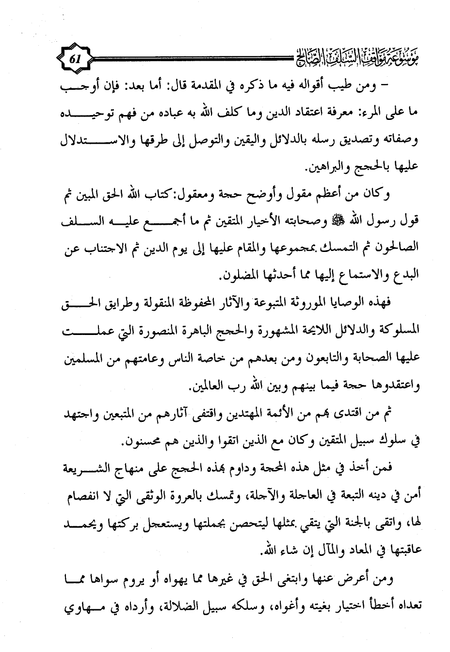 وكان من أعظم مقول وأوضح حجة ومعقول: كتاب الله الحق المبين ثم قول رسول الله - صلى الله عليه وسلم - وصحابته الأخيار المتقين ثم ما أجمع عليه السلف الصالحون ثم التمسك بمجموعها والمقام عليها إلى يوم الدين ثم الاجتناب عن البدع والاستماع إليها مما أحدثها المضلون.
