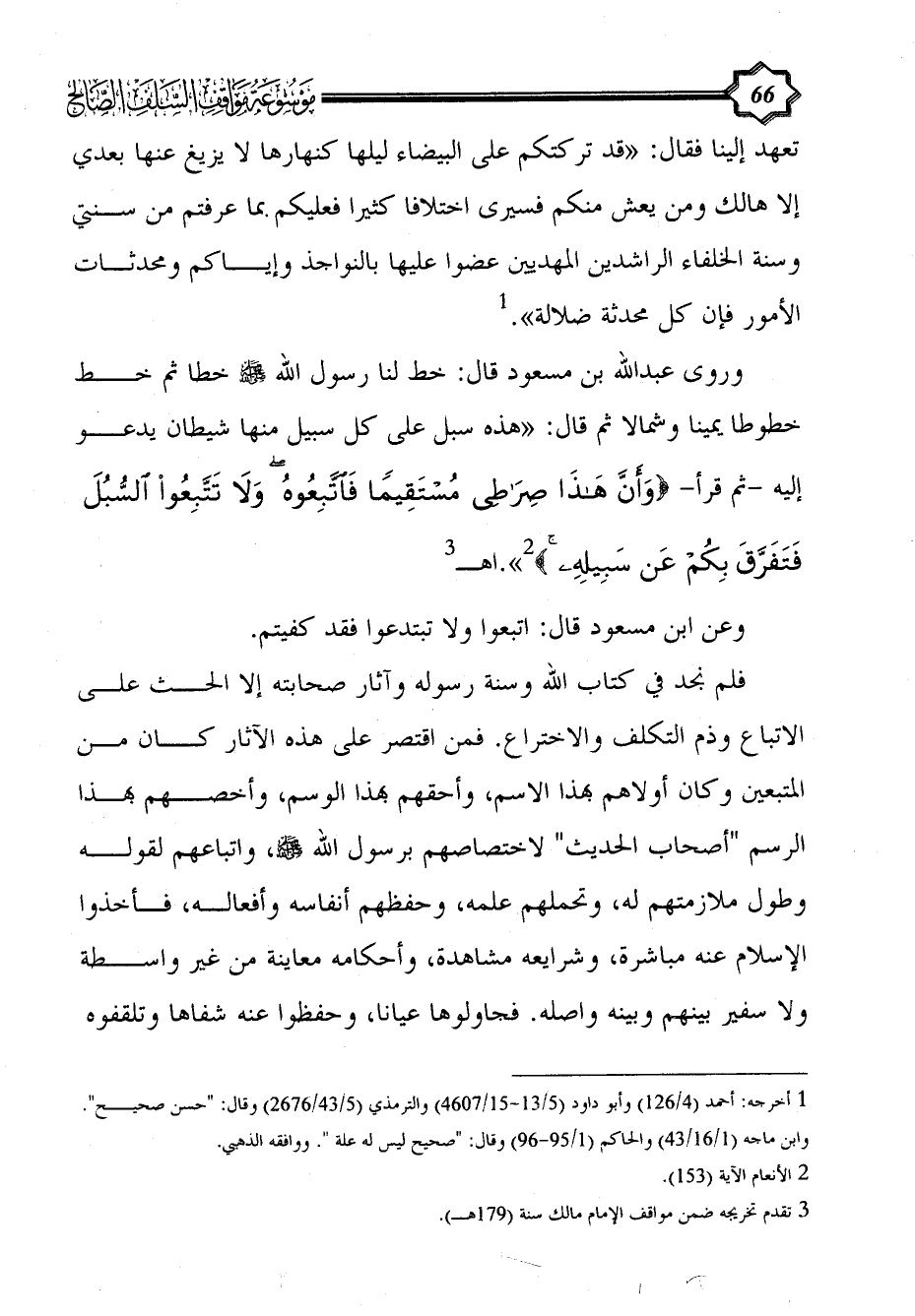 وروى عبد الله بن مسعود قال: خط لنا رسول الله - صلى الله عليه وسلم - خطا ثم خط خطوطا يمينا وشمالا ثم قال: «هذه سبل على كل سبيل منها شيطان يدعو إليه -ثم قرأ- {وَأَنَّ هَذَا صِرَاطِي مُسْتَقِيمًا فَاتَّبِعُوهُ وَلَا تَتَّبِعُوا السُّبُلَ فَتَفَرَّقَ بِكُمْ عَنْ سَبِيلِهِ} (¬2)».اهـ (¬3)