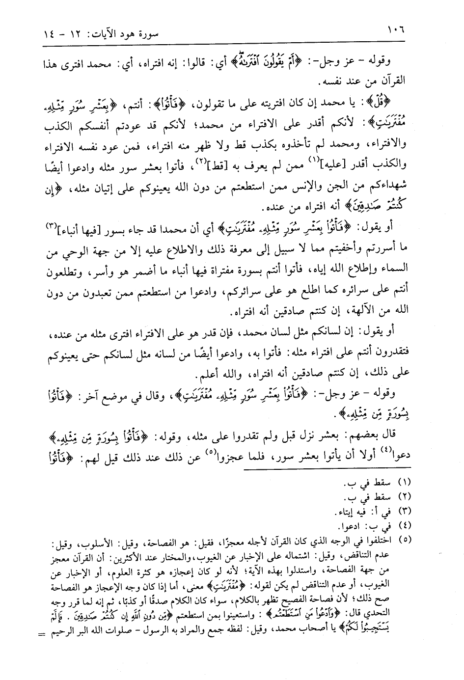 وقوله - عَزَّ وَجَلَّ -: (فَأْتُوا بِعَشْرِ سُوَرٍ مِثْلِهِ مُفْتَرَيَاتٍ)، وقال في موضع آخر: (فَأْتُوا بِسُورَةٍ مِنْ مِثْلِهِ).