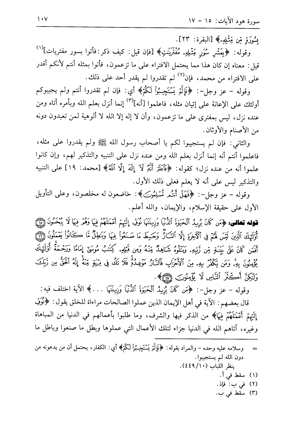 قوله تعالى: (مَنْ كَانَ يُرِيدُ الْحَيَاةَ الدُّنْيَا وَزِينَتَهَا نُوَفِّ إِلَيْهِمْ أَعْمَالَهُمْ فِيهَا وَهُمْ فِيهَا لَا يُبْخَسُونَ (15) أُولَئِكَ الَّذِينَ لَيْسَ لَهُمْ فِي الْآخِرَةِ إِلَّا النَّارُ وَحَبِطَ مَا صَنَعُوا فِيهَا وَبَاطِلٌ مَا كَانُوا يَعْمَلُونَ (16) أَفَمَنْ كَانَ عَلَى بَيِّنَةٍ مِنْ رَبِّهِ وَيَتْلُوهُ شَاهِدٌ مِنْهُ وَمِنْ قَبْلِهِ كِتَابُ مُوسَى إِمَامًا وَرَحْمَةً أُولَئِكَ يُؤْمِنُونَ بِهِ وَمَنْ يَكْفُرْ بِهِ مِنَ الْأَحْزَابِ فَالنَّارُ مَوْعِدُهُ فَلَا تَكُ فِي مِرْيَةٍ مِنْهُ إِنَّهُ الْحَقُّ مِنْ رَبِّكَ وَلَكِنَّ أَكْثَرَ النَّاسِ لَا يُؤْمِنُونَ (17)