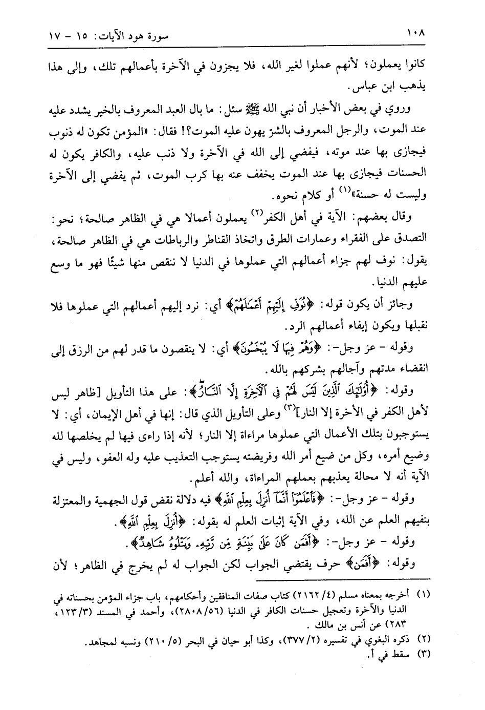 وقوله: (أُولَئِكَ الَّذِينَ لَيْسَ لَهُمْ فِي الْآخِرَةِ إِلَّا النَّارُ وَحَبِطَ مَا صَنَعُوا فِيهَا وَبَاطِلٌ مَا كَانُوا يَعْمَلُونَ (16) على هذا التأويل أظاهر ليس لأهل الكفر في الآخرة إلا النار، وعلى التأويل الذي قال: إنها في أهل الإيمان، أي: لا يستوجبون بتلك الأعمال التي عملوها مراءاة إلا النار؛ لأنه إذا راءى فيها لم يخلصها لله وضيع أمره، وكل من ضيع أمر اللَّه وفريضته يستوجب التعذيب عليه وله العفو، وليس في الآية أنه لا محالة يعذبهم بعملهم المراءاة، واللَّه أعلم.