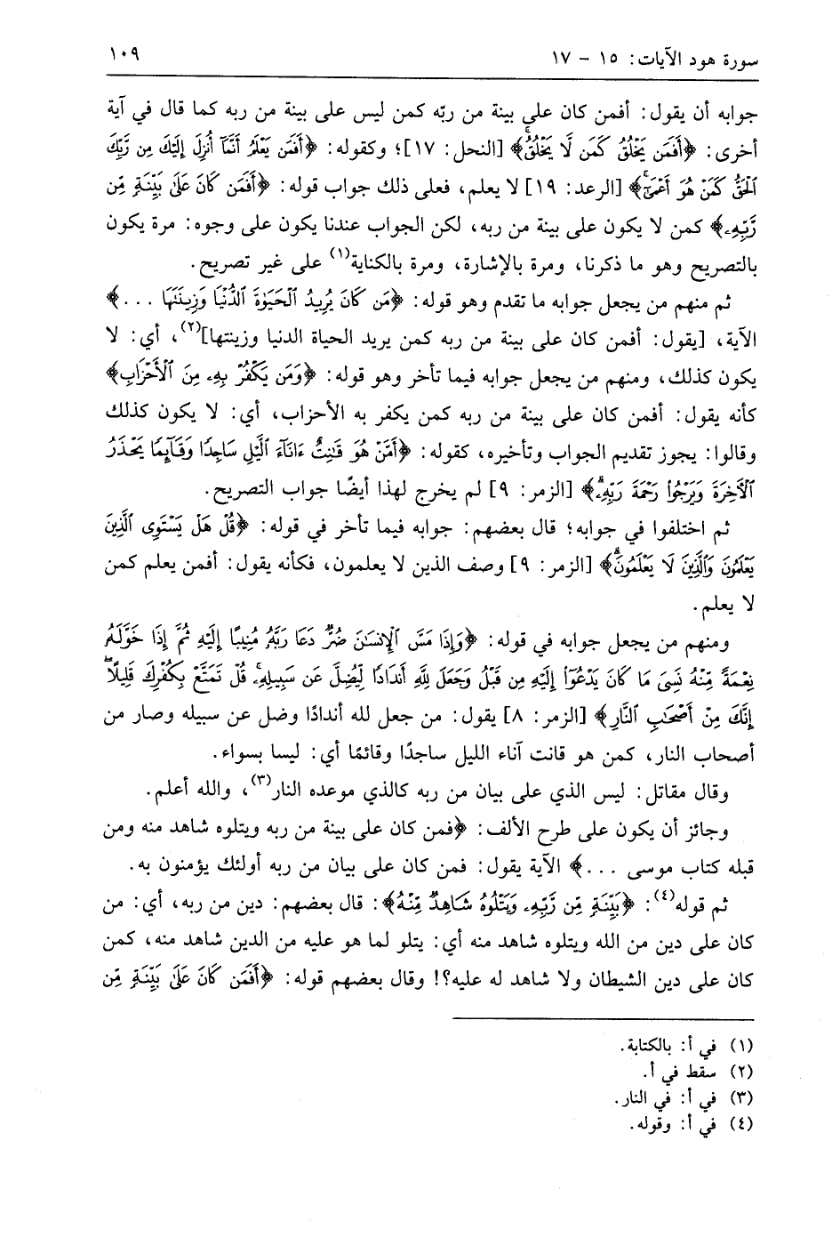 ثم منهم من يجعل جوابه ما تقدم وهو قوله: (مَنْ كَانَ يُرِيدُ الْحَيَاةَ الدُّنْيَا وَزِينَتَهَا. . .) الآية، يقول: أفمن كان على بينة من ربه كمن يريد الحياة الدنيا وزينتها، أي: لا يكون كذلك، ومنهم من يجعل جوابه فيما تأخر وهو قوله: (وَمَنْ يَكْفُرْ بِهِ مِنَ الْأَحْزَابِ) كأنه يقول: أفمن كان على بينة من ربه كمن يكفر به الأحزاب، أي: لا يكون كذلك وقالوا: يجوز تقديم الجواب وتأخيره، كقوله: (أَمَّنْ هُوَ قَانِتٌ آنَاءَ اللَّيْلِ سَاجِدًا وَقَائِمًا يَحْذَرُ الْآخِرَةَ وَيَرْجُو رَحْمَةَ رَبِّهِ)، لم يخرج لهذا أيضًا جواب التصريح.