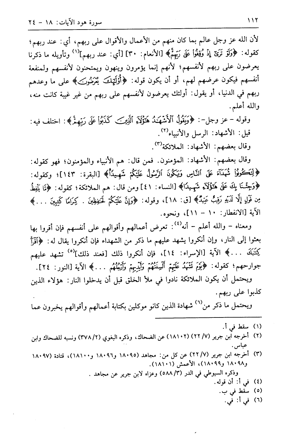 وقَالَ بَعْضُهُمْ: الأشهاد: المؤمنون. فمن قال: هم الأنبياء والمؤمنون؛ فهو كقوله: (لِتَكُونُوا شُهَدَاءَ عَلَى النَّاسِ وَيَكُونَ الرَّسُولُ عَلَيْكُمْ شَهِيدًا)؛ وكقوله: (وَجِئْنَا بِكَ عَلَى هَؤُلَاءِ شَهِيدًا)، ومن قال: هم الملائكة؛ كقوله: (مَا يَلْفِظُ مِنْ قَوْلٍ إِلَّا لَدَيْهِ رَقِيبٌ عَتِيدٌ)، وقوله: (وَإِنَّ عَلَيْكُمْ لَحَافِظِينَ (10) كِرَامًا كَاتِبِينَ (11) يَعْلَمُونَ مَا تَفْعَلُونَ (12). ونحوه.