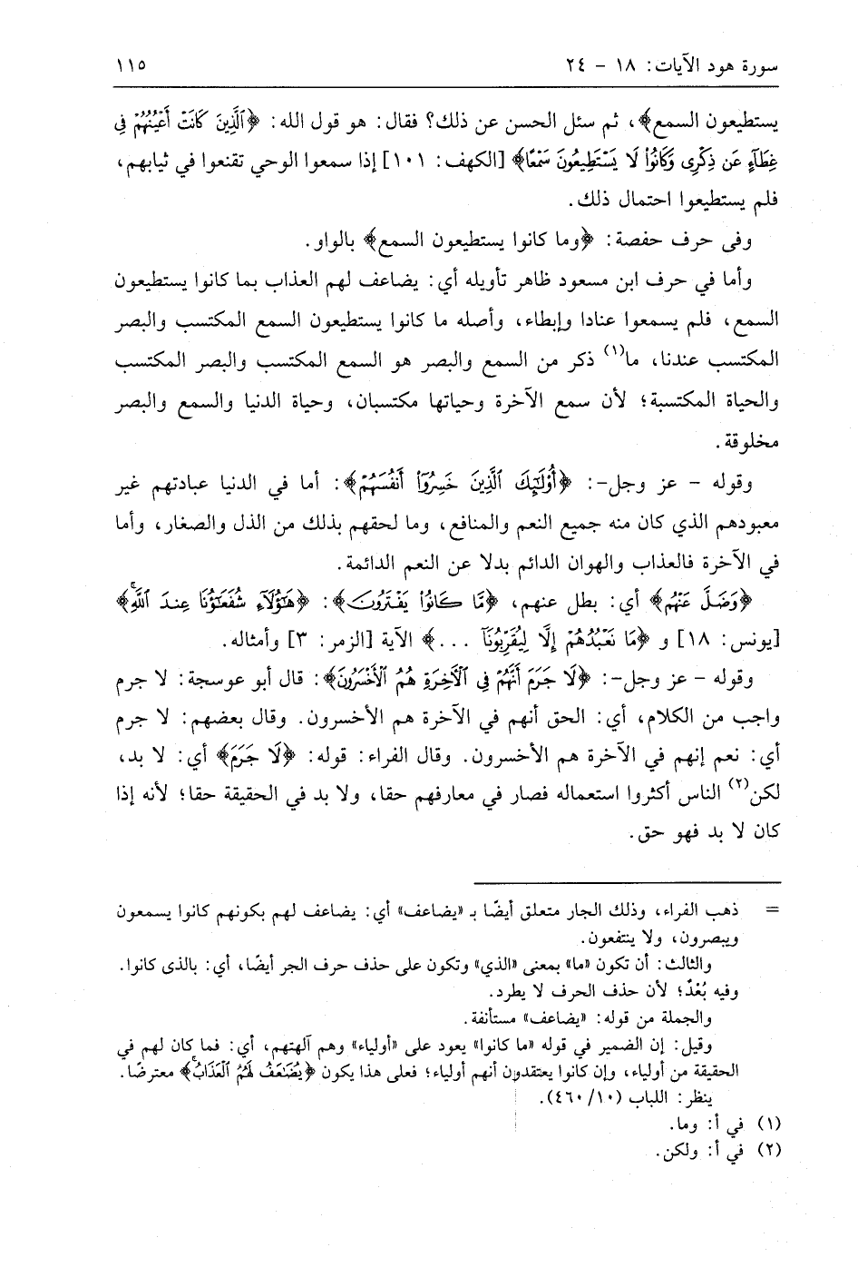 وأما في حرف ابن مسعود ظاهر تأويله أي: يضاعف لهم العذاب بما كانوا يستطيعون السمع، فلم يسمعوا عنادا وإبطاء، وأصله ما كانوا يستطيعون السمع المكتسب والبصر المكتسب عندنا، ما ذكر من السمع والبصر هو السمع المكتسب والبصر المكتسب والحياة المكتسبة؛ لأن سمع الآخرة وحياتها مكتسبان، وحياة الدنيا والسمع والبصر مخلوقة.