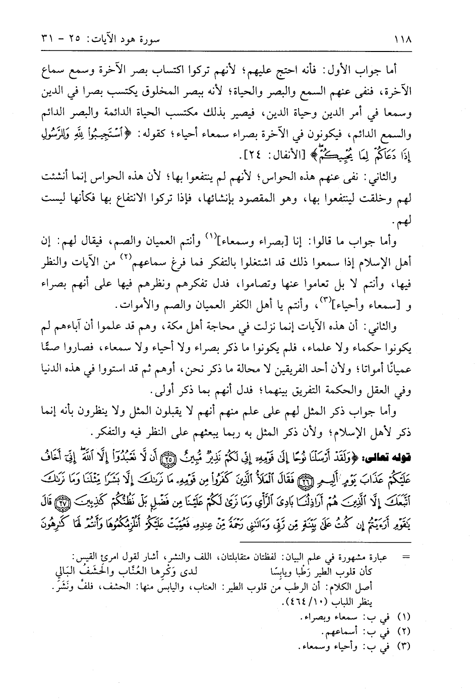 قوله تعالى: (وَلَقَدْ أَرْسَلْنَا نُوحًا إِلَى قَوْمِهِ إِنِّي لَكُمْ نَذِيرٌ مُبِينٌ (25) أَنْ لَا تَعْبُدُوا إِلَّا اللَّهَ إِنِّي أَخَافُ عَلَيْكُمْ عَذَابَ يَوْمٍ أَلِيمٍ (26) فَقَالَ الْمَلَأُ الَّذِينَ كَفَرُوا مِنْ قَوْمِهِ مَا نَرَاكَ إِلَّا بَشَرًا مِثْلَنَا وَمَا نَرَاكَ اتَّبَعَكَ إِلَّا الَّذِينَ هُمْ أَرَاذِلُنَا بَادِيَ الرَّأْيِ وَمَا نَرَى لَكُمْ عَلَيْنَا مِنْ فَضْلٍ بَلْ نَظُنُّكُمْ كَاذِبِينَ (27) قَالَ يَا قَوْمِ أَرَأَيْتُمْ إِنْ كُنْتُ عَلَى بَيِّنَةٍ مِنْ رَبِّي وَآتَانِي رَحْمَةً مِنْ عِنْدِهِ فَعُمِّيَتْ عَلَيْكُمْ أَنُلْزِمُكُمُوهَا وَأَنْتُمْ لَهَا كَارِهُونَ (28)
