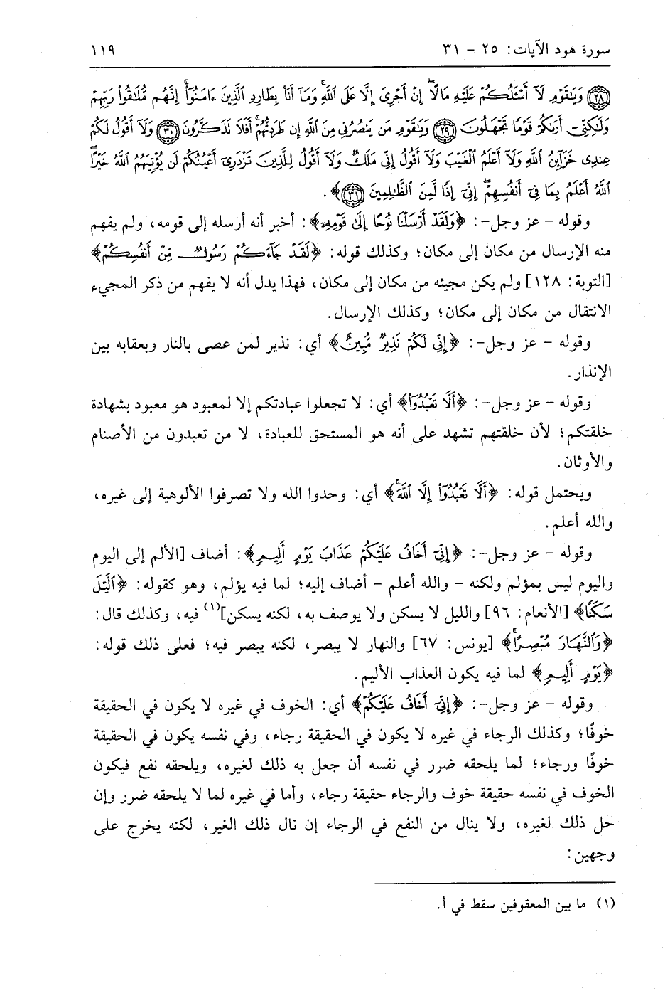وقوله - عَزَّ وَجَلَّ -: (أَنْ لَا تَعْبُدُوا إِلَّا اللَّهَ إِنِّي أَخَافُ عَلَيْكُمْ عَذَابَ يَوْمٍ أَلِيمٍ (26) أي: لا تجعلوا عبادتكم إلا لمعبود هو معبود بشهادة خلقتكم؛ لأن خلقتهم تشهد على أنه هو المستحق للعبادة، لا من تعبدون من الأصنام والأوثان.