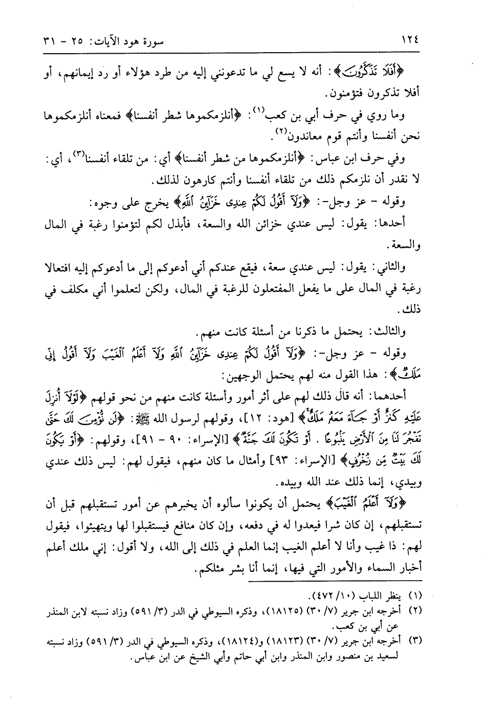 وقوله - عَزَّ وَجَلَّ -: (وَلَا أَقُولُ لَكُمْ عِنْدِي خَزَائِنُ اللَّهِ وَلَا أَعْلَمُ الْغَيْبَ وَلَا أَقُولُ إِنِّي مَلَكٌ): هذا القول منه لهم يحتمل الوجهين: