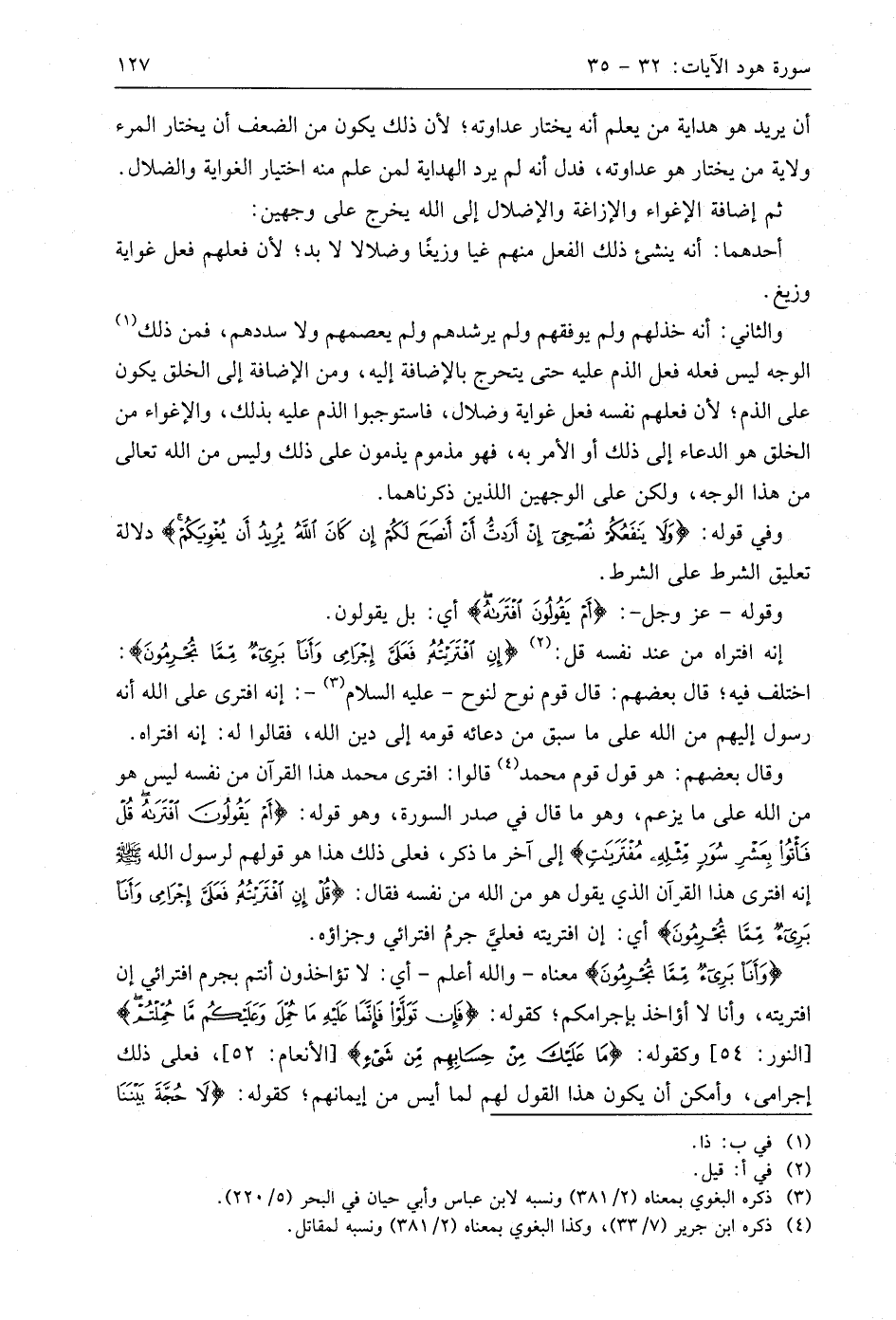 وقَالَ بَعْضُهُمْ: هو قول قوم مُحَمَّد قالوا: افترى مُحَمَّد هذا القرآن من نفسه ليس هو من اللَّه على ما يزعم، وهو ما قال في صدر السورة، وهو قوله: (أَمْ يَقُولُونَ افْتَرَاهُ قُلْ فَأْتُوا بِعَشْرِ سُوَرٍ مِثْلِهِ مُفْتَرَيَاتٍ) إلى آخر ما ذكر، فعلى ذلك هذا هو قولهم لرسول اللَّه - صَلَّى اللَّهُ عَلَيهِ وَسَلَّمَ - إنه افترى هذا القرآن الذي يقول هو من اللَّه من نفسه فقال: (قُلْ إِنِ افْتَرَيْتُهُ فَعَلَيَّ إِجْرَامِي وَأَنَا بَرِيءٌ مِمَّا تُجْرِمُونَ) أي: إن افتريته فعليَّ جرمُ افترائي وجزاؤه.