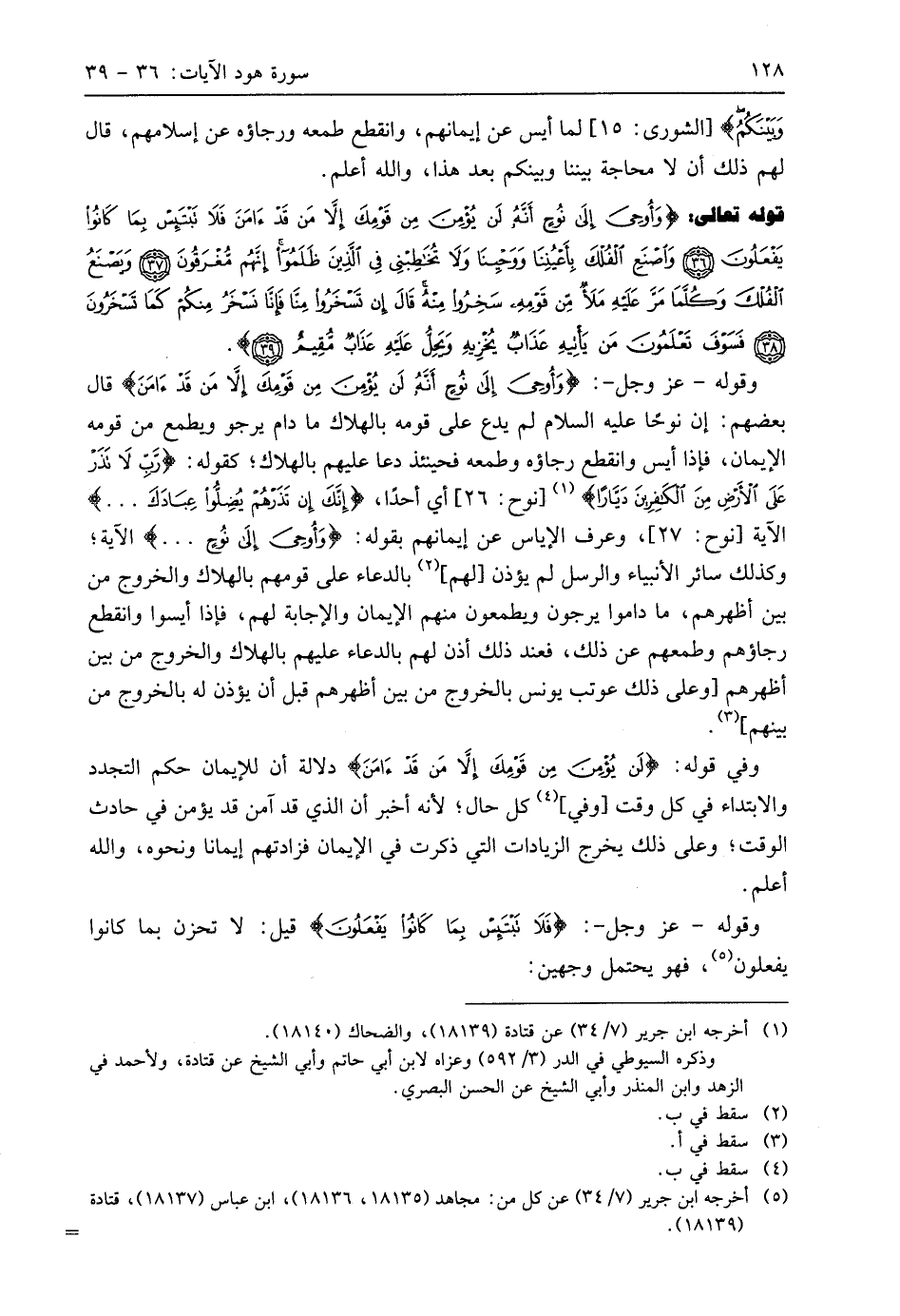 قوله تعالى: (وَأُوحِيَ إِلَى نُوحٍ أَنَّهُ لَنْ يُؤْمِنَ مِنْ قَوْمِكَ إِلَّا مَنْ قَدْ آمَنَ فَلَا تَبْتَئِسْ بِمَا كَانُوا يَفْعَلُونَ (36) وَاصْنَعِ الْفُلْكَ بِأَعْيُنِنَا وَوَحْيِنَا وَلَا تُخَاطِبْنِي فِي الَّذِينَ ظَلَمُوا إِنَّهُمْ مُغْرَقُونَ (37) وَيَصْنَعُ الْفُلْكَ وَكُلَّمَا مَرَّ عَلَيْهِ مَلَأٌ مِنْ قَوْمِهِ سَخِرُوا مِنْهُ قَالَ إِنْ تَسْخَرُوا مِنَّا فَإِنَّا نَسْخَرُ مِنْكُمْ كَمَا تَسْخَرُونَ (38) فَسَوْفَ تَعْلَمُونَ مَنْ يَأْتِيهِ عَذَابٌ يُخْزِيهِ وَيَحِلُّ عَلَيْهِ عَذَابٌ مُقِيمٌ (39)