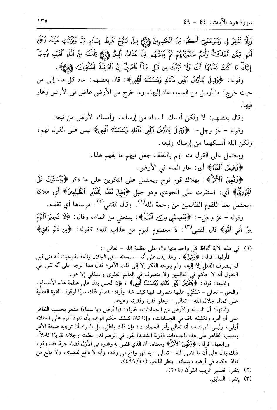 وقوله: (وَقِيلَ يَا أَرْضُ ابْلَعِي مَاءَكِ وَيَا سَمَاءُ أَقْلِعِي ... (44) قَالَ بَعْضُهُمْ: عاد كل ماء إلى من حيث خرج: ما أرسل من السماء عاد إليها، وما خرج من الأرض غاض في الأرض وغار فيها.
