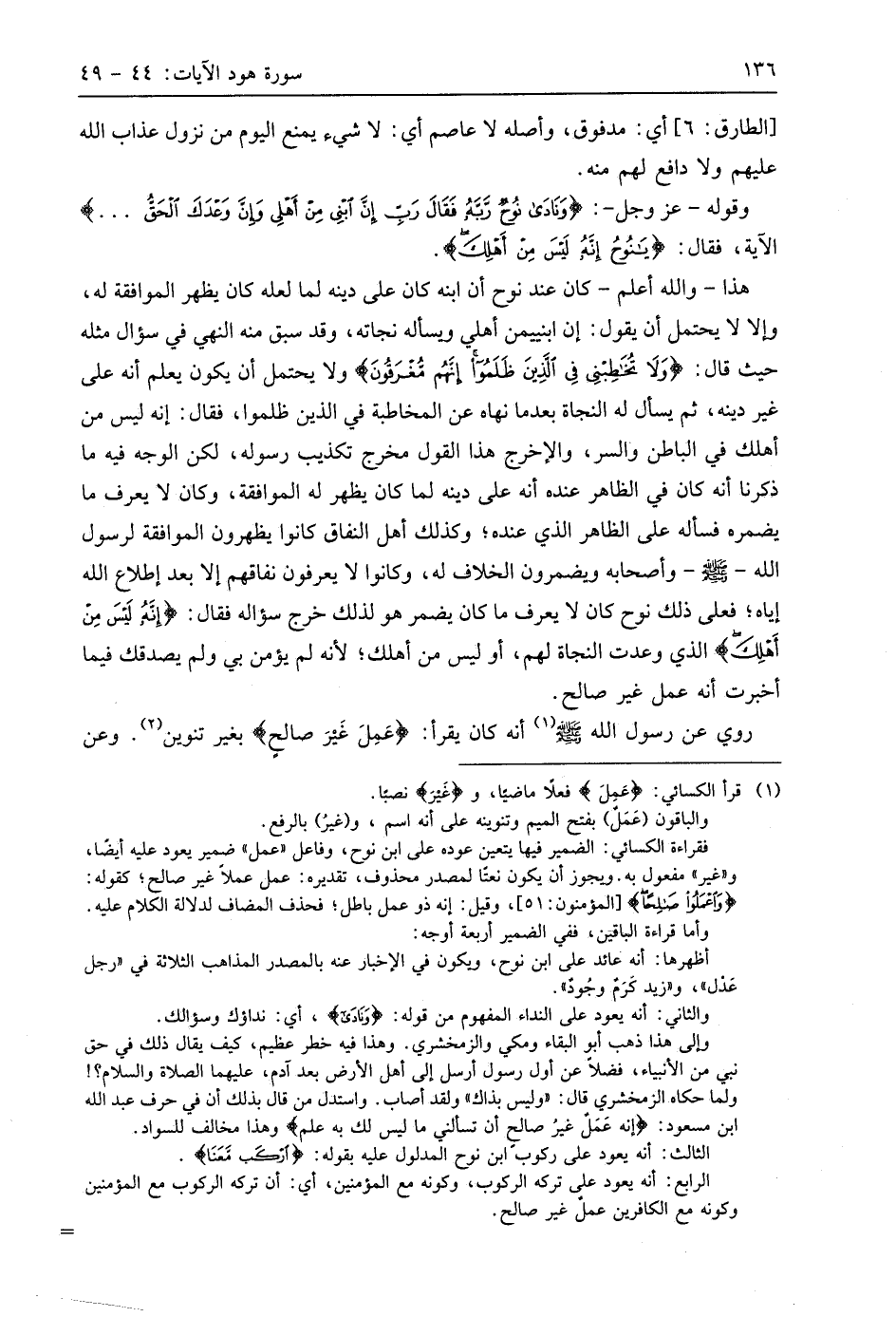 وقوله - عَزَّ وَجَلَّ -: (وَنَادَى نُوحٌ رَبَّهُ فَقَالَ رَبِّ إِنَّ ابْنِي مِنْ أَهْلِي وَإِنَّ وَعْدَكَ الْحَقُّ ... (45) الآية، فقال: (يَا نُوحُ إِنَّهُ لَيْسَ مِنْ أَهْلِكَ).