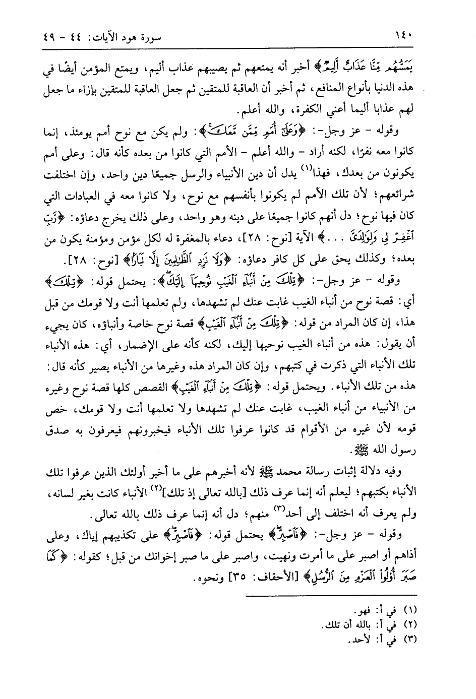 وقوله - عَزَّ وَجَلَّ -: (تِلْكَ مِنْ أَنْبَاءِ الْغَيْبِ نُوحِيهَا إِلَيْكَ مَا كُنْتَ تَعْلَمُهَا أَنْتَ وَلَا قَوْمُكَ مِنْ قَبْلِ هَذَا فَاصْبِرْ إِنَّ الْعَاقِبَةَ لِلْمُتَّقِينَ (49) يحتمل قوله: (تِلْكَ) أي: قصة نوح من أنباء الغيب غابت عنك لم تشهدها، ولم تعلمها أنت ولا قومك من قبل هذا، إن كان المراد من قوله: (تِلْكَ مِنْ أَنْبَاءِ الْغَيْبِ) قصة نوح خاصة وأنباؤه، كان يجيء أن يقول: هذه من أنباء الغيب نوحيها إليك، لكنه كأنه على الإضمار، أي: هذه الأنباء تلك الأنباء التي ذكرت في كتبهم، وإن كان المراد هذه وغيرها من الأنباء يصير كأنه قال: هذه من تلك الأنباء. ويحتمل قوله: (تِلْكَ مِنْ أَنْبَاءِ الْغَيْبِ) القصص كلها قصة نوح وغيره من الأنبياء من أنباء الغيب، غاب عنك لم تشهدها ولا تعلمها أنت ولا قومك، خص قومه لأن غيره من الأقوام قد كانوا عرفوا تلك الأنباء فيخبرونهم فيعرفون به صدق رسول اللَّه - صَلَّى اللَّهُ عَلَيهِ وَسَلَّمَ -.