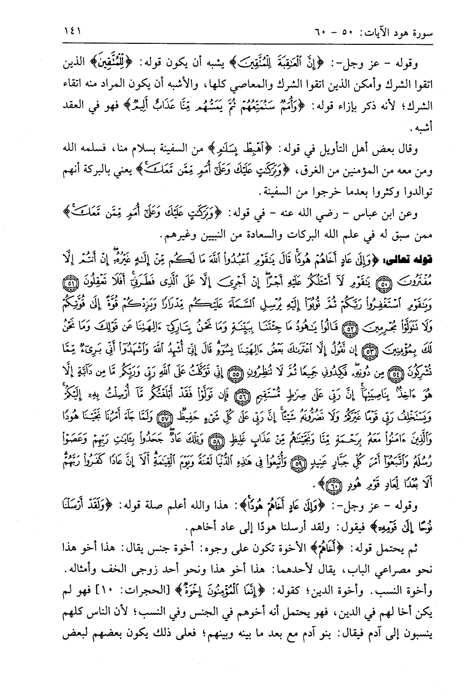 قوله تعالى: (وَإِلَى عَادٍ أَخَاهُمْ هُودًا قَالَ يَا قَوْمِ اعْبُدُوا اللَّهَ مَا لَكُمْ مِنْ إِلَهٍ غَيْرُهُ إِنْ أَنْتُمْ إِلَّا مُفْتَرُونَ (50) يَا قَوْمِ لَا أَسْأَلُكُمْ عَلَيْهِ أَجْرًا إِنْ أَجْرِيَ إِلَّا عَلَى الَّذِي فَطَرَنِي أَفَلَا تَعْقِلُونَ (51) وَيَا قَوْمِ اسْتَغْفِرُوا رَبَّكُمْ ثُمَّ تُوبُوا إِلَيْهِ يُرْسِلِ السَّمَاءَ عَلَيْكُمْ مِدْرَارًا وَيَزِدْكُمْ قُوَّةً إِلَى قُوَّتِكُمْ وَلَا تَتَوَلَّوْا مُجْرِمِينَ (52) قَالُوا يَا هُودُ مَا جِئْتَنَا بِبَيِّنَةٍ وَمَا نَحْنُ بِتَارِكِي آلِهَتِنَا عَنْ قَوْلِكَ وَمَا نَحْنُ لَكَ بِمُؤْمِنِينَ (53) إِنْ نَقُولُ إِلَّا اعْتَرَاكَ بَعْضُ آلِهَتِنَا بِسُوءٍ قَالَ إِنِّي أُشْهِدُ اللَّهَ وَاشْهَدُوا أَنِّي بَرِيءٌ مِمَّا تُشْرِكُونَ (54) مِنْ دُونِهِ فَكِيدُونِي جَمِيعًا ثُمَّ لَا تُنْظِرُونِ (55) إِنِّي تَوَكَّلْتُ عَلَى اللَّهِ رَبِّي وَرَبِّكُمْ مَا مِنْ دَابَّةٍ إِلَّا هُوَ آخِذٌ بِنَاصِيَتِهَا إِنَّ رَبِّي عَلَى صِرَاطٍ مُسْتَقِيمٍ (56) فَإِنْ تَوَلَّوْا فَقَدْ أَبْلَغْتُكُمْ مَا أُرْسِلْتُ بِهِ إِلَيْكُمْ وَيَسْتَخْلِفُ رَبِّي قَوْمًا غَيْرَكُمْ وَلَا تَضُرُّونَهُ شَيْئًا إِنَّ رَبِّي عَلَى كُلِّ شَيْءٍ حَفِيظٌ (57) وَلَمَّا جَاءَ أَمْرُنَا نَجَّيْنَا هُودًا وَالَّذِينَ آمَنُوا مَعَهُ بِرَحْمَةٍ مِنَّا وَنَجَّيْنَاهُمْ مِنْ عَذَابٍ غَلِيظٍ (58) وَتِلْكَ عَادٌ جَحَدُوا بِآيَاتِ رَبِّهِمْ وَعَصَوْا رُسُلَهُ وَاتَّبَعُوا أَمْرَ كُلِّ جَبَّارٍ عَنِيدٍ (59) وَأُتْبِعُوا فِي هَذِهِ الدُّنْيَا لَعْنَةً وَيَوْمَ الْقِيَامَةِ أَلَا إِنَّ عَادًا كَفَرُوا رَبَّهُمْ أَلَا بُعْدًا لِعَادٍ قَوْمِ هُودٍ (60)