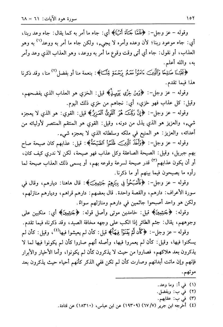 وقوله - عَزَّ وَجَلَّ -: (وَأَخَذَ الَّذِينَ ظَلَمُوا الصَّيْحَةُ فَأَصْبَحُوا فِي دِيَارِهِمْ جَاثِمِينَ (67) قيل: عذابهم كان صيحة صاح بهم جبريل، وقيل: الصيحة الصاعقة وكل عذاب فهو صيحة، لكن لا ندري كيف كان، أو أن يكون عذابهم قدر صيحة لسرعة وقوعه بهم، أو يسمى ذلك العذاب صيحة لما رأوه ما يصيحون فيما بينهم أو ما ذكرنا.