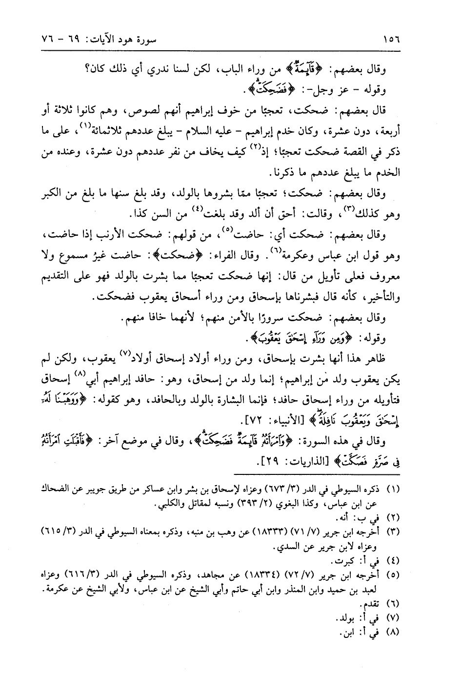 وقَالَ بَعْضُهُمْ: ضحكت أي: حاضت، من قولهم: ضحكت الأرنب إذا حاضت، وهو قول ابن عَبَّاسٍ وعكرمة. وقال الفراء: (فَضَحِكَتْ): حاضت غيرُ مسموع ولا معروف فعلى تأويل من قال: إنها ضحكت تعجبًا مما بشرت بالولد فهو على التقديم والتأخير، كأنه قال فبشرناها بإسحاق ومن وراء أسحاق يعقوب فضحكت.