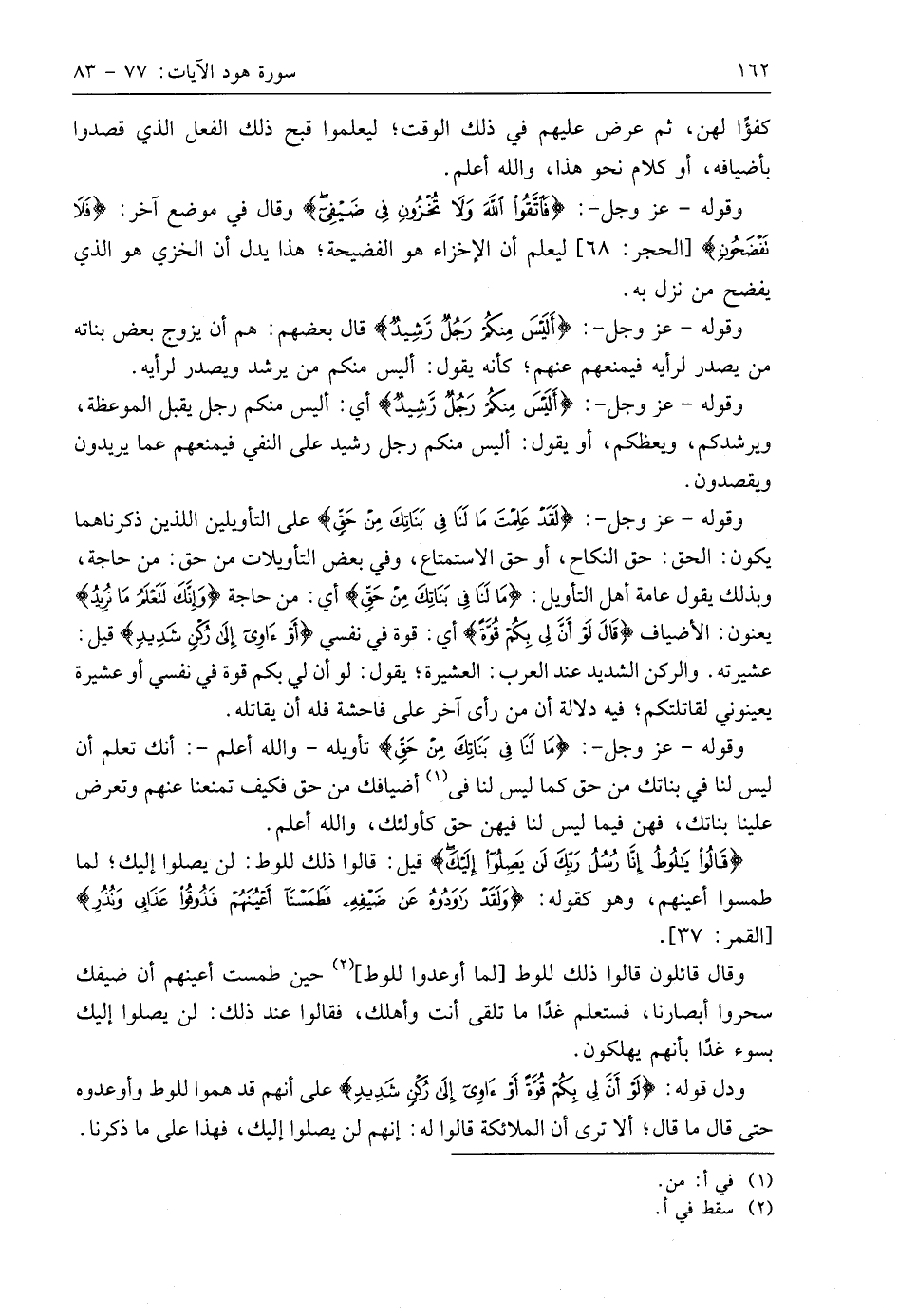 وقوله - عَزَّ وَجَلَّ -: (لَقَدْ عَلِمْتَ مَا لَنَا فِي بَنَاتِكَ مِنْ حَقٍّ وَإِنَّكَ لَتَعْلَمُ مَا نُرِيدُ (79) على التأويلين اللذين ذكرناهما يكون: الحق: حق النكاح، أو حق الاستمتاع، وفي بعض التأويلات من حق: من حاجة، وبذلك يقول عامة أهل التأويل: (لَقَدْ عَلِمْتَ مَا لَنَا فِي بَنَاتِكَ مِنْ حَقٍّ) أي: من حاجة (وَإِنَّكَ لَتَعْلَمُ مَا نُرِيدُ) يعنون: الأضياف (قَالَ لَوْ أَنَّ لِي بِكُمْ قُوَّةً أَوْ آوِي إِلَى رُكْنٍ شَدِيدٍ (80) أي: قوة في نفسي (أَوْ آوِي إِلَى رُكْنٍ شَدِيدٍ) قيل: عشيرته. والركن الشديد عند العرب: العشيرة؛ يقول: لو أن لي بكم قوة في نفسي أو عشيرة يعينوني لقاتلتكم؛ فيه دلالة أن من رأى آخر على فاحشة فله أن يقاتله.