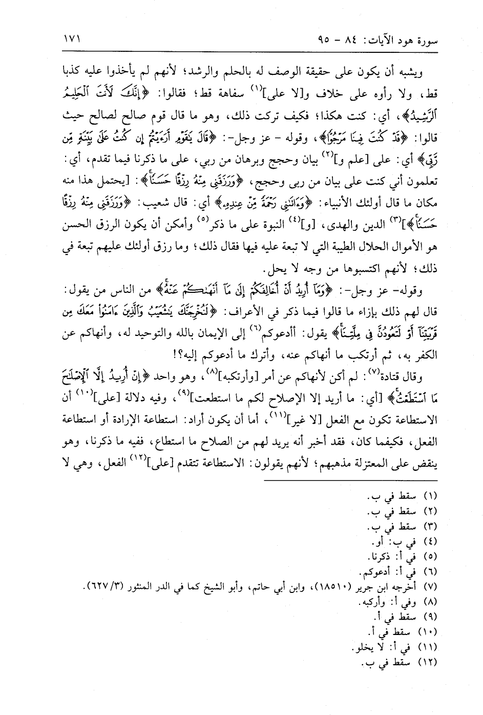 ويشبه أن يكون على حقيقة الوصف له بالحلم والرشد؛ لأنهم لم يأخذوا عليه كذبا قط، ولا رأوه على خلاف ولا على سفَاهة قط؛ فقالوا: (إِنَّكَ لَأَنْتَ الْحَلِيمُ الرَّشِيدُ)، أي: كنت هكذا؛ فكيف تركت ذلك، وهو ما قال قوم صالح لصالح حيث قالوا: (قَدْ كُنْتَ فِينَا مَرْجُوًّا). وقوله - عَزَّ وَجَلَّ -: (قَالَ يَا قَوْمِ أَرَأَيْتُمْ إِنْ كُنْتُ عَلَى بَيِّنَةٍ مِنْ رَبِّي وَرَزَقَنِي مِنْهُ رِزْقًا حَسَنًا وَمَا أُرِيدُ أَنْ أُخَالِفَكُمْ إِلَى مَا أَنْهَاكُمْ عَنْهُ إِنْ أُرِيدُ إِلَّا الْإِصْلَاحَ مَا اسْتَطَعْتُ وَمَا تَوْفِيقِي إِلَّا بِاللَّهِ عَلَيْهِ تَوَكَّلْتُ وَإِلَيْهِ أُنِيبُ (88) أي: على علم وبيان وحجج وبرهان من ربي، على ما ذكرنا فيما تقدم، أي: تعلمون أني كنت على بيان من ربى وحجج، (وَرَزَقَنِي مِنْهُ رِزْقًا حَسَنًا): يحتمل هذا منه مكان ما قال أُولَئِكَ الأنبياء: (وَآتَانِي رَحْمَةً مِنْ عِنْدِهِ) أي: قال شعيب: (وَرَزَقَنِي مِنْهُ رِزْقًا حَسَنًا)، الدِّين والهدى، والنبوة على ما ذكر وأمكن أن يكون الرزق الحسن هو الأموال الحلال الطيبة التي لا تبعة عليه فيها فقال ذلك؛ وما رزق أُولَئِكَ عليهم تبعة في ذلك؛ لأنهم اكتسبوها من وجه لا يحل.