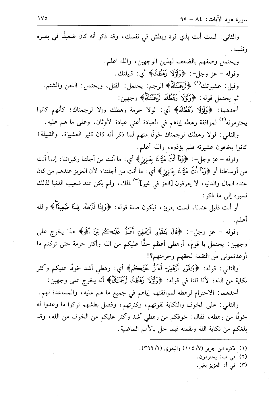 أحدهما: (وَلَوْلَا رَهْطُكَ) أي: لولا حرمة رهطك وإلا لرجمناك؛ كأنهم كانوا يحترمونه لموافقة رهطه إياهم في العبادة أعني عبادة الأوثان، وعلى ما هم عليه.