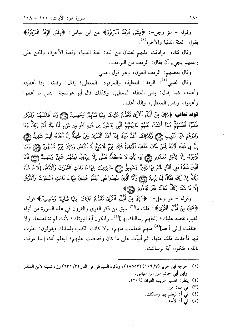 قوله تعالى: (ذَلِكَ مِنْ أَنْبَاءِ الْقُرَى نَقُصُّهُ عَلَيْكَ مِنْهَا قَائِمٌ وَحَصِيدٌ (100) وَمَا ظَلَمْنَاهُمْ وَلَكِنْ ظَلَمُوا أَنْفُسَهُمْ فَمَا أَغْنَتْ عَنْهُمْ آلِهَتُهُمُ الَّتِي يَدْعُونَ مِنْ دُونِ اللَّهِ مِنْ شَيْءٍ لَمَّا جَاءَ أَمْرُ رَبِّكَ وَمَا زَادُوهُمْ غَيْرَ تَتْبِيبٍ (101) وَكَذَلِكَ أَخْذُ رَبِّكَ إِذَا أَخَذَ الْقُرَى وَهِيَ ظَالِمَةٌ إِنَّ أَخْذَهُ أَلِيمٌ شَدِيدٌ (102) إِنَّ فِي ذَلِكَ لَآيَةً لِمَنْ خَافَ عَذَابَ الْآخِرَةِ ذَلِكَ يَوْمٌ مَجْمُوعٌ لَهُ النَّاسُ وَذَلِكَ يَوْمٌ مَشْهُودٌ (103) وَمَا نُؤَخِّرُهُ إِلَّا لِأَجَلٍ مَعْدُودٍ (104) يَوْمَ يَأْتِ لَا تَكَلَّمُ نَفْسٌ إِلَّا بِإِذْنِهِ فَمِنْهُمْ شَقِيٌّ وَسَعِيدٌ (105) فَأَمَّا الَّذِينَ شَقُوا فَفِي النَّارِ لَهُمْ فِيهَا زَفِيرٌ وَشَهِيقٌ (106) خَالِدِينَ فِيهَا مَا دَامَتِ السَّمَاوَاتُ وَالْأَرْضُ إِلَّا مَا شَاءَ رَبُّكَ إِنَّ رَبَّكَ فَعَّالٌ لِمَا يُرِيدُ (107) وَأَمَّا الَّذِينَ سُعِدُوا فَفِي الْجَنَّةِ خَالِدِينَ فِيهَا مَا دَامَتِ السَّمَاوَاتُ وَالْأَرْضُ إِلَّا مَا شَاءَ رَبُّكَ عَطَاءً غَيْرَ مَجْذُوذٍ (108)