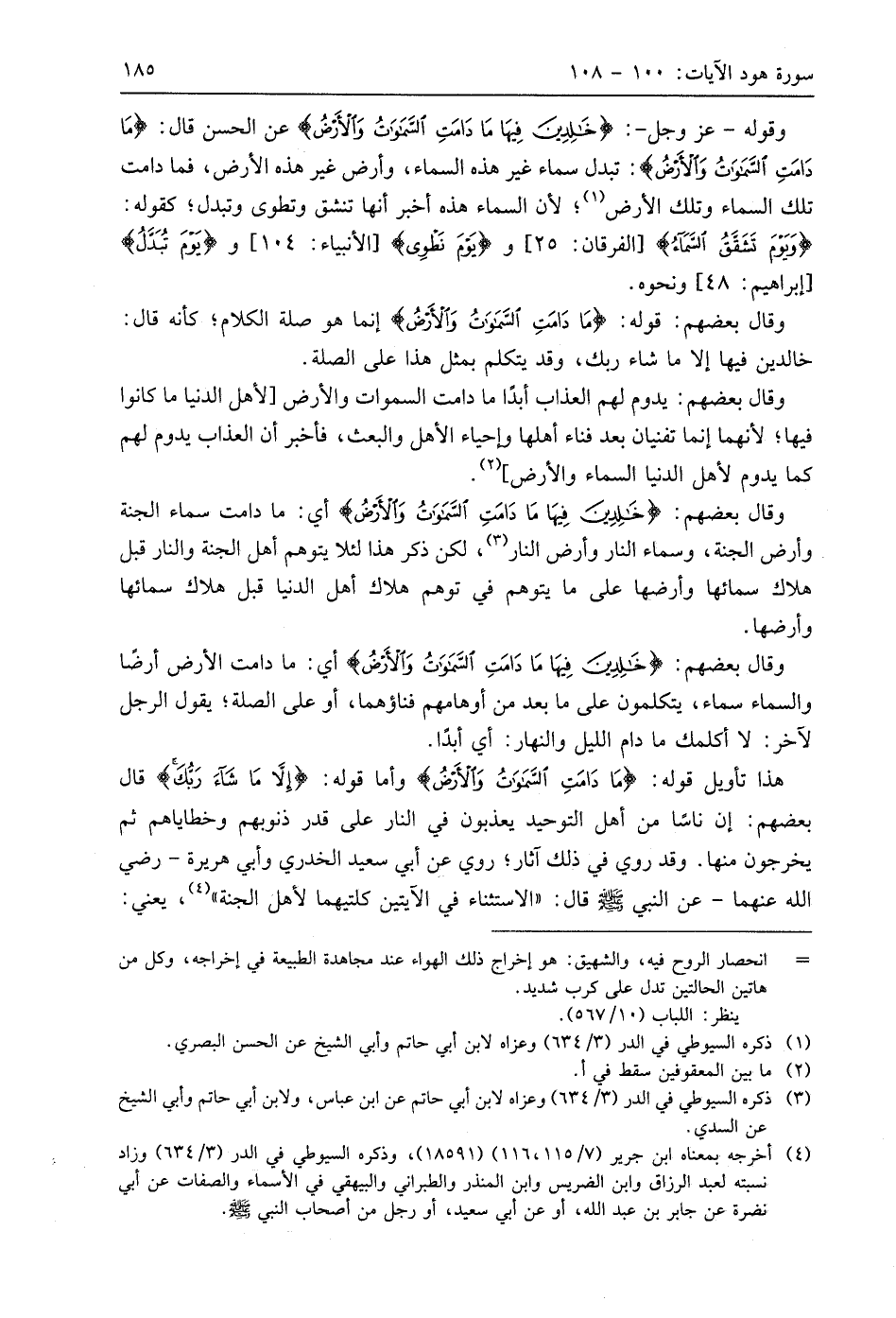 وقَالَ بَعْضُهُمْ: (خَالِدِينَ فِيهَا مَا دَامَتِ السَّمَاوَاتُ وَالْأَرْضُ) أي: ما دامت الأرض أرضًا والسماء سماء، يتكلمون على ما بعد من أوهامهم فناؤهما، أو على الصلة؛ يقول الرجل لآخر: لا أكلمك ما دام الليل والنهار: أي أبدًا.