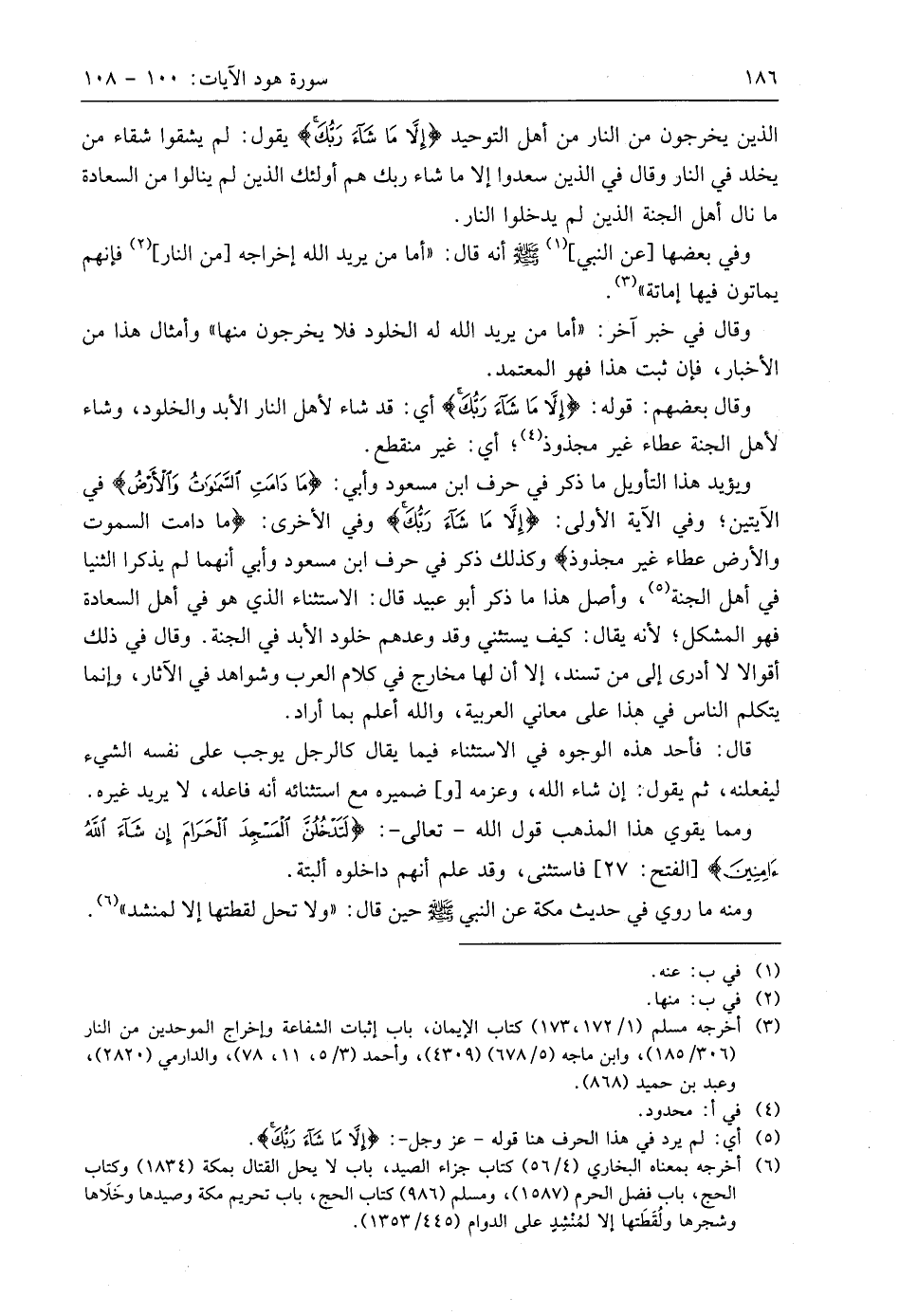 ويؤيد هذا التأويل ما ذكر في حرف ابن مسعود وأبي: (مَا دَامَتِ السَّمَاوَاتُ وَالْأَرْضُ) في الآيتين؛ وفي الآية الأولى: (إِلَّا مَا شَاءَ رَبُّكَ) وفي الأخرى: (ما دامت السموت والأرض عطاء غير مجذوذ) وكذلك ذكر في حرف ابن مسعود وأبي أنهما لم يذكرا الثنيا في أهل الجنة، وأصل هذا ما ذكر أبو عبيد قال: الاستثناء الذي هو في أهل السعادة فهو المشكل؛ لأنه يقال: كيف يستثني وقد وعدهم خلود الأبد في الجنة. وقال في ذلك أقوالا لا أدرى إلى من تسند، إلا أن لها مخارج في كلام العرب وشواهد في الآثار، وإنما يتكلم الناس في هذا على معاني العربية، واللَّه أعلم بما أراد.