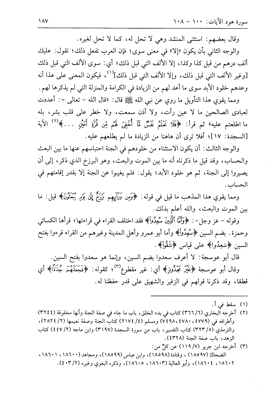 وقوله - عَزَّ وَجَلَّ -: (وَأَمَّا الَّذِينَ سُعِدُوا فَفِي الْجَنَّةِ خَالِدِينَ فِيهَا مَا دَامَتِ السَّمَاوَاتُ وَالْأَرْضُ إِلَّا مَا شَاءَ رَبُّكَ عَطَاءً غَيْرَ مَجْذُوذٍ (108) فقد اختلف القراء في قراءتها؛ قرأها الكسائي وحمزة. بضم السين (سُعِدُوا) وأما أبو عمرو وأهل المدينة وغيرهم من القراء قرءوا بفتح السين (سَعِدُوا) على قياس (شَقُوا).