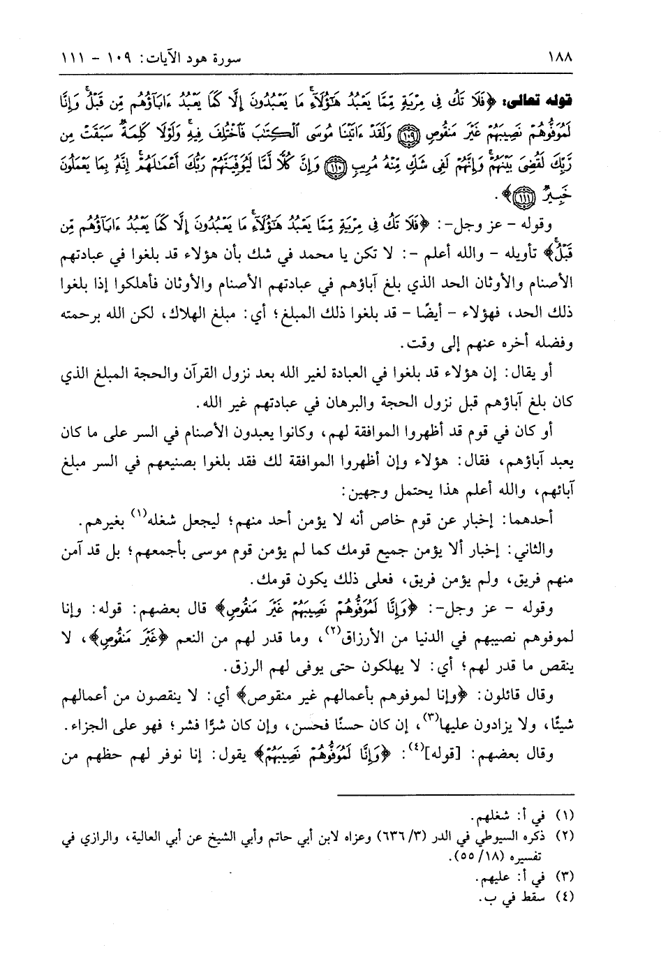 قوله تعالى: (فَلَا تَكُ فِي مِرْيَةٍ مِمَّا يَعْبُدُ هَؤُلَاءِ مَا يَعْبُدُونَ إِلَّا كَمَا يَعْبُدُ آبَاؤُهُمْ مِنْ قَبْلُ وَإِنَّا لَمُوَفُّوهُمْ نَصِيبَهُمْ غَيْرَ مَنْقُوصٍ (109) وَلَقَدْ آتَيْنَا مُوسَى الْكِتَابَ فَاخْتُلِفَ فِيهِ وَلَوْلَا كَلِمَةٌ سَبَقَتْ مِنْ رَبِّكَ لَقُضِيَ بَيْنَهُمْ وَإِنَّهُمْ لَفِي شَكٍّ مِنْهُ مُرِيبٍ (110) وَإِنَّ كُلًّا لَمَّا لَيُوَفِّيَنَّهُمْ رَبُّكَ أَعْمَالَهُمْ إِنَّهُ بِمَا يَعْمَلُونَ خَبِيرٌ (111)