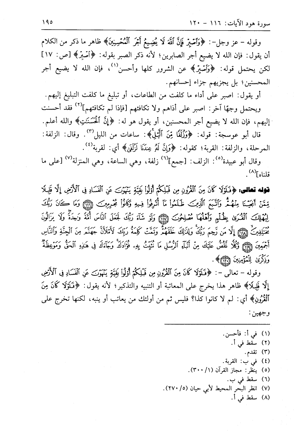 وقوله - تعالى -: (فَلَوْلَا كَانَ مِنَ الْقُرُونِ مِنْ قَبْلِكُمْ أُولُو بَقِيَّةٍ يَنْهَوْنَ عَنِ الْفَسَادِ فِي الْأَرْضِ إِلَّا قَلِيلًا) وظاهر هذا يخرج على المعاتبة أو التنبيه والتذكير؛ لأنه يقول: (فَلَولَا كَانَ مِنَ الْقُرُونِ) أي: لم لا كانوا كذا؟ فليس ثم من أُولَئِكَ من يعاتب أو ينبه، لكنها تخرج على وجهين:
