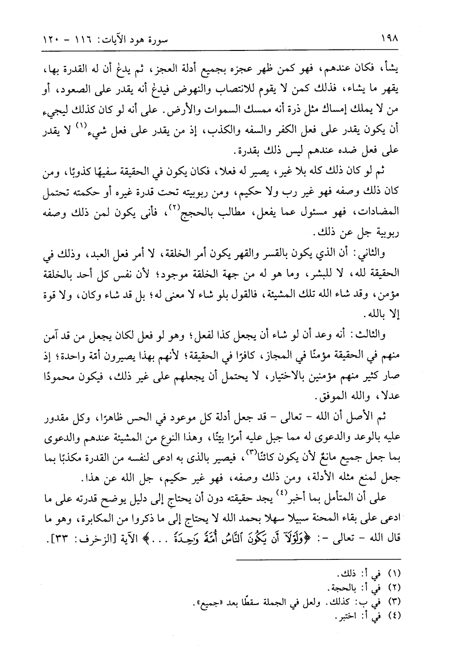 والثالث: أنه وعد أن لو شاء أن يجعل كذا لفعل؛ وهو لو فعل لكان يجعل من قد آمن منهم في الحقيقة مؤمنًا في المجاز، كافرًا في الحقيقة؛ لأنهم بهذا يصيرون أمّة واحدة؛ إذ صار كثير منهم مؤمنين بالاختيار، لا يحتمل أن يجعلهم على غير ذلك، فيكون محمودًا عدلا، واللَّه الموفق.