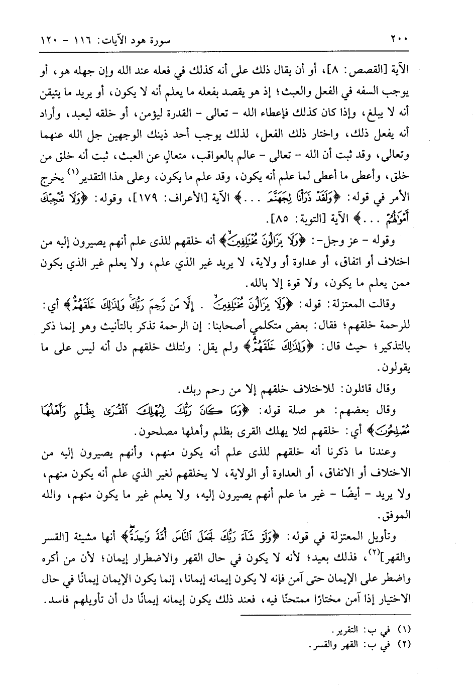 وتأويل المعتزلة في قوله: (وَلَوْ شَاءَ رَبُّكَ لَجَعَلَ النَّاسَ أُمَّةً وَاحِدَةً) أنها مشيئة القسر والقهر، فذلك بعيد؛ لأنه لا يكون في حال القهر والاضطرار إيمان؛ لأن من أكره واضطر على الإيمان حتى آمن فإنه لا يكون إيمانه إيمانا، إنما يكون الإيمان إيمانًا في حال الاحنتيار إذا آمن مختارًا ممتحنًا فيه، فعند ذلك يكون إيمانه إيمانًا دل أن تأويلهم فاسد.