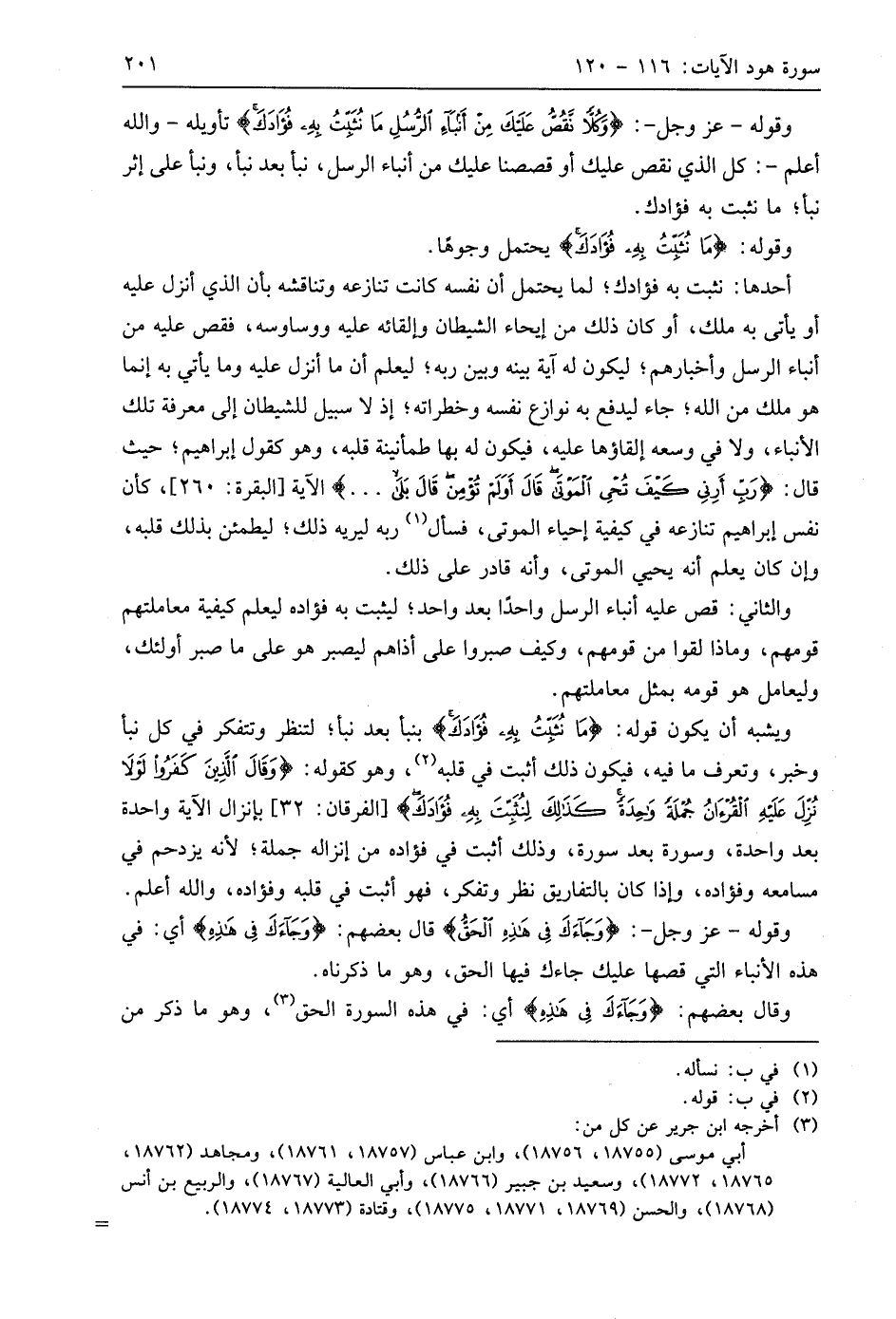 وقوله - عَزَّ وَجَلَّ -: (وَكُلًّا نَقُصُّ عَلَيْكَ مِنْ أَنْبَاءِ الرُّسُلِ مَا نُثَبِّتُ بِهِ فُؤَادَكَ وَجَاءَكَ فِي هَذِهِ الْحَقُّ وَمَوْعِظَةٌ وَذِكْرَى لِلْمُؤْمِنِينَ (120) تأويله - والله أعلم -: كل الذي نقص عليك أو قصصنا عليك من أنباء الرسل، نبأ بعد نبإ، ونبأ على إثر نبإ؛ ما نثبت به فؤادك.