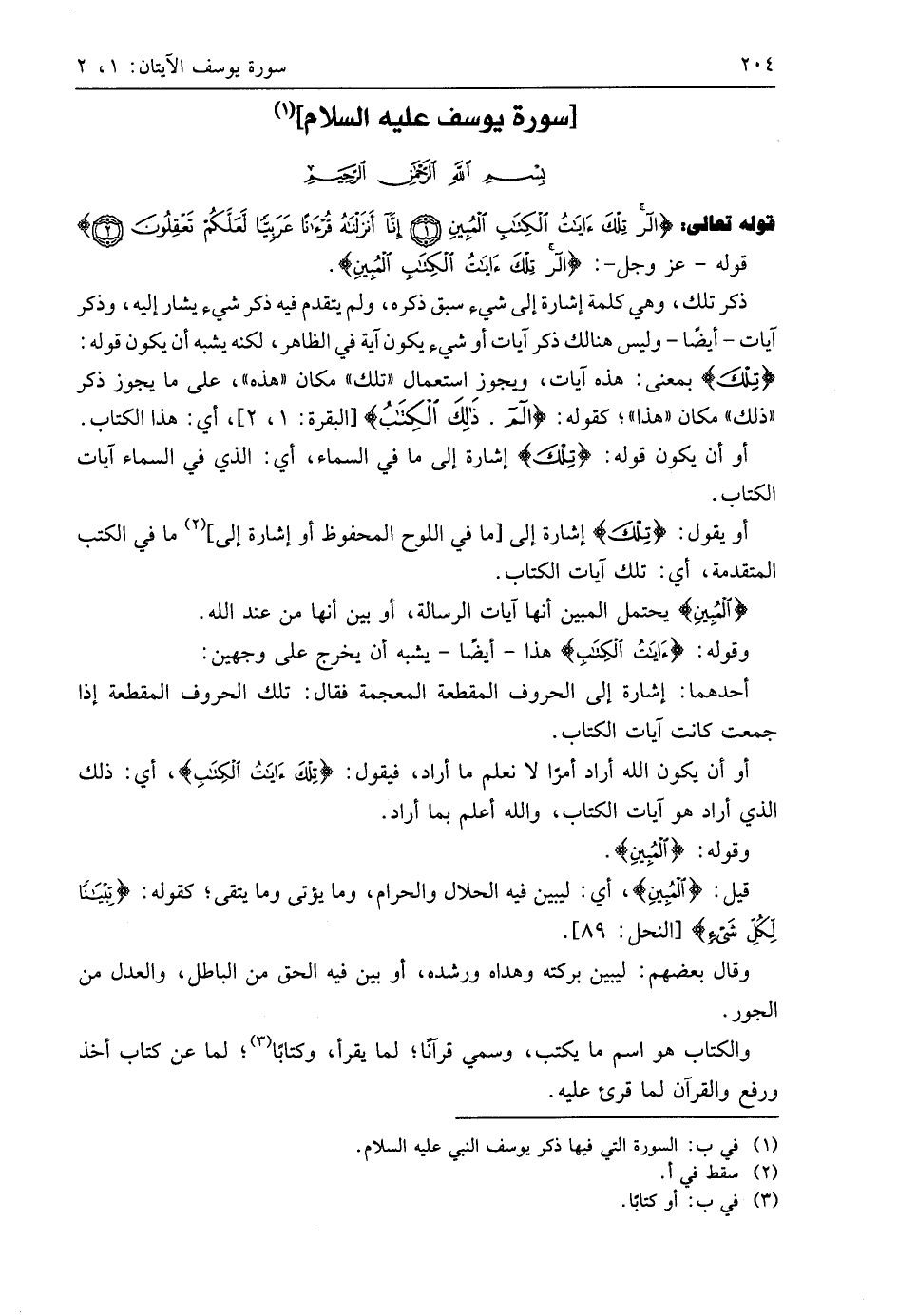 قوله - عَزَّ وَجَلَّ -: (الر تِلْكَ آيَاتُ الْكِتَابِ الْمُبِينِ).