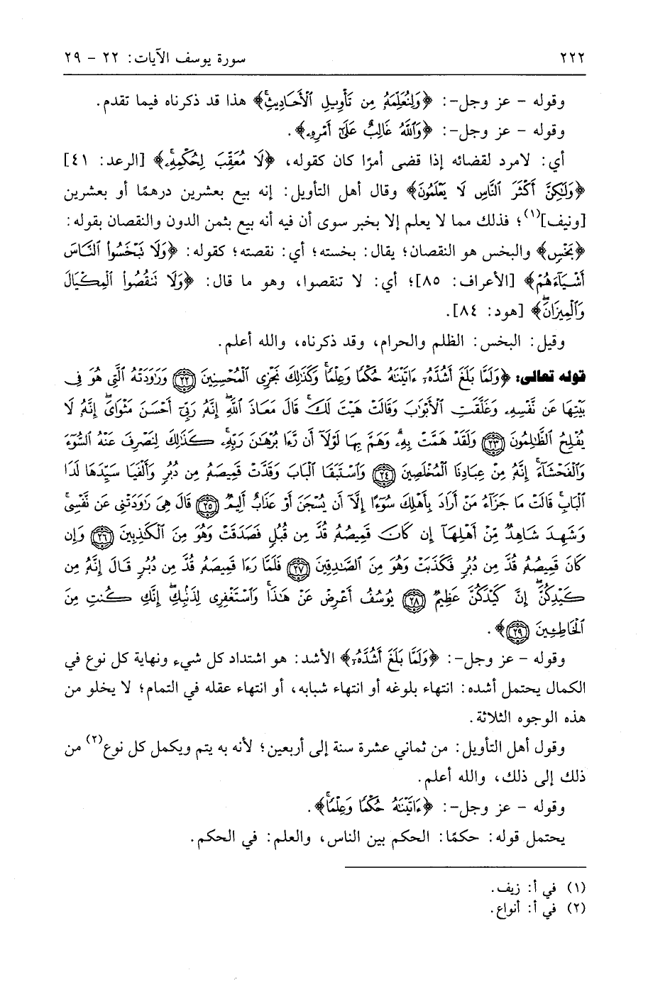 وقوله - عَزَّ وَجَلَّ -: (وَلَمَّا بَلَغَ أَشُدَّهُ) الأشد: هو اشتداد كل شيء ونهاية كل نوع في الكمال يحتمل أشده: انتهاء بلوغه أو انتهاء شبابه، أو انتهاء عقله في التمام؛ لا يخلو من هذه الوجوه الثلاثة.