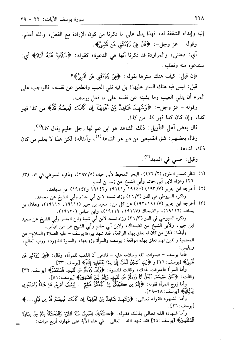 وقوله - عَزَّ وَجَلَّ -: (قَالَ هِيَ رَاوَدَتْنِي عَنْ نَفْسِي وَشَهِدَ شَاهِدٌ مِنْ أَهْلِهَا إِنْ كَانَ قَمِيصُهُ قُدَّ مِنْ قُبُلٍ فَصَدَقَتْ وَهُوَ مِنَ الْكَاذِبِينَ (26)