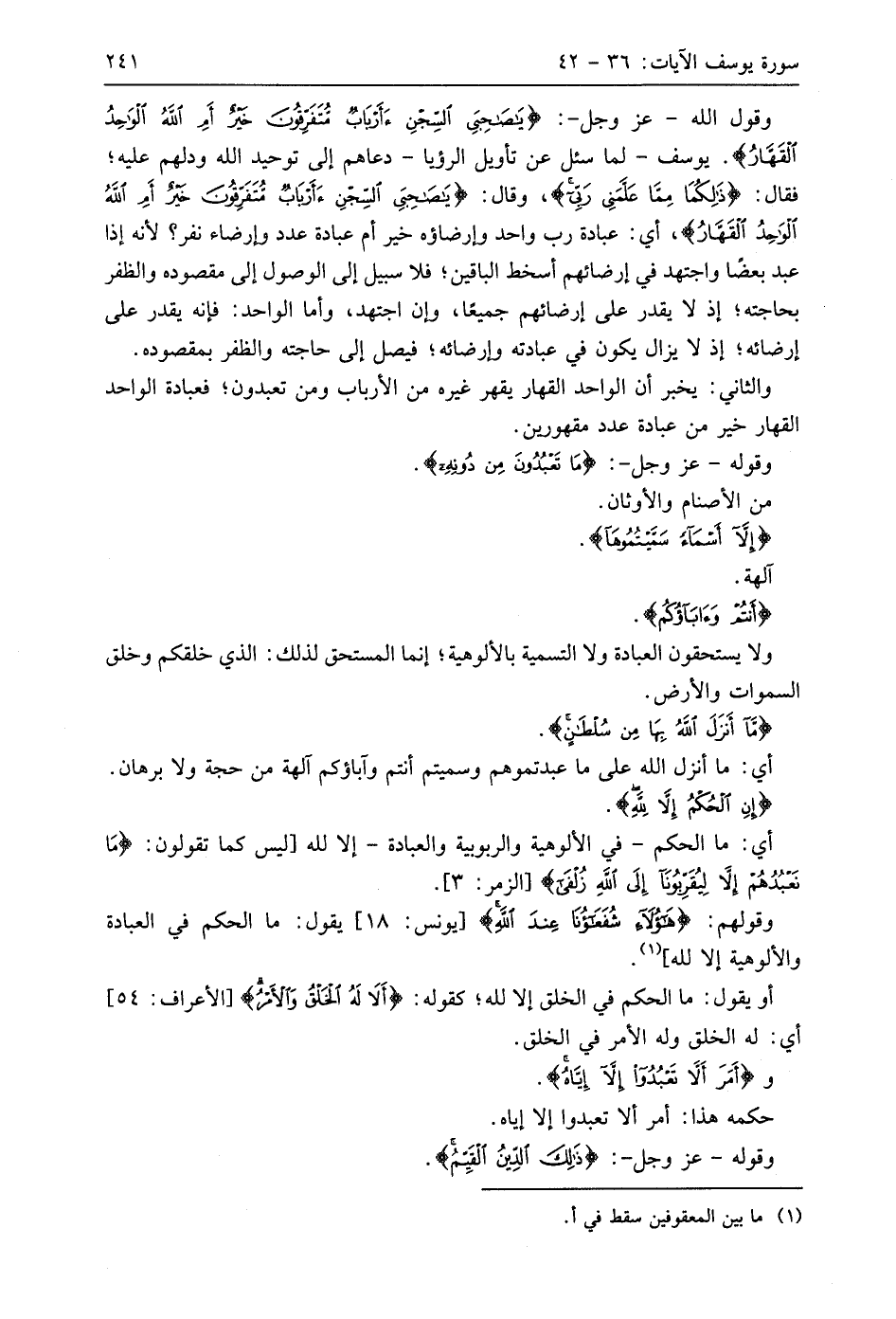 وقول اللَّه - عَزَّ وَجَلَّ -: (يَا صَاحِبَيِ السِّجْنِ أَأَرْبَابٌ مُتَفَرِّقُونَ خَيْرٌ أَمِ اللَّهُ الْوَاحِدُ الْقَهَّارُ (39) يوسف - لما سئل عن تأويل الرؤيا - دعاهم إلى توحيد اللَّه ودلهم عليه؛ فقال: (ذَلِكُمَا مِمَّا عَلَّمَنِي رَبِّي)، وقال: (يَا صَاحِبَيِ السِّجْنِ أَأَرْبَابٌ مُتَفَرِّقُونَ خَيْرٌ أَمِ اللَّهُ الْوَاحِدُ الْقَهَّارُ)، أي: عبادة رب واحد وإرضاؤه خير أم عبادة عدد وإرضاء نفر؟ لأنه إذا عبد بعضًا واجتهد في إرضائهم أسخط الباقين؛ فلا سبيل إلى الوصول إلى مقصوده والظفر بحاجته؛ إذ لا يقدر على إرضائهم جميعًا، وإن اجتهد، وأما الواحد: فإنه يقدر على إرضائه؛ إذ لا يزال يكون في عبادته وإرضائه؛ فيصل إلى حاجته والظفر بمقصوده.