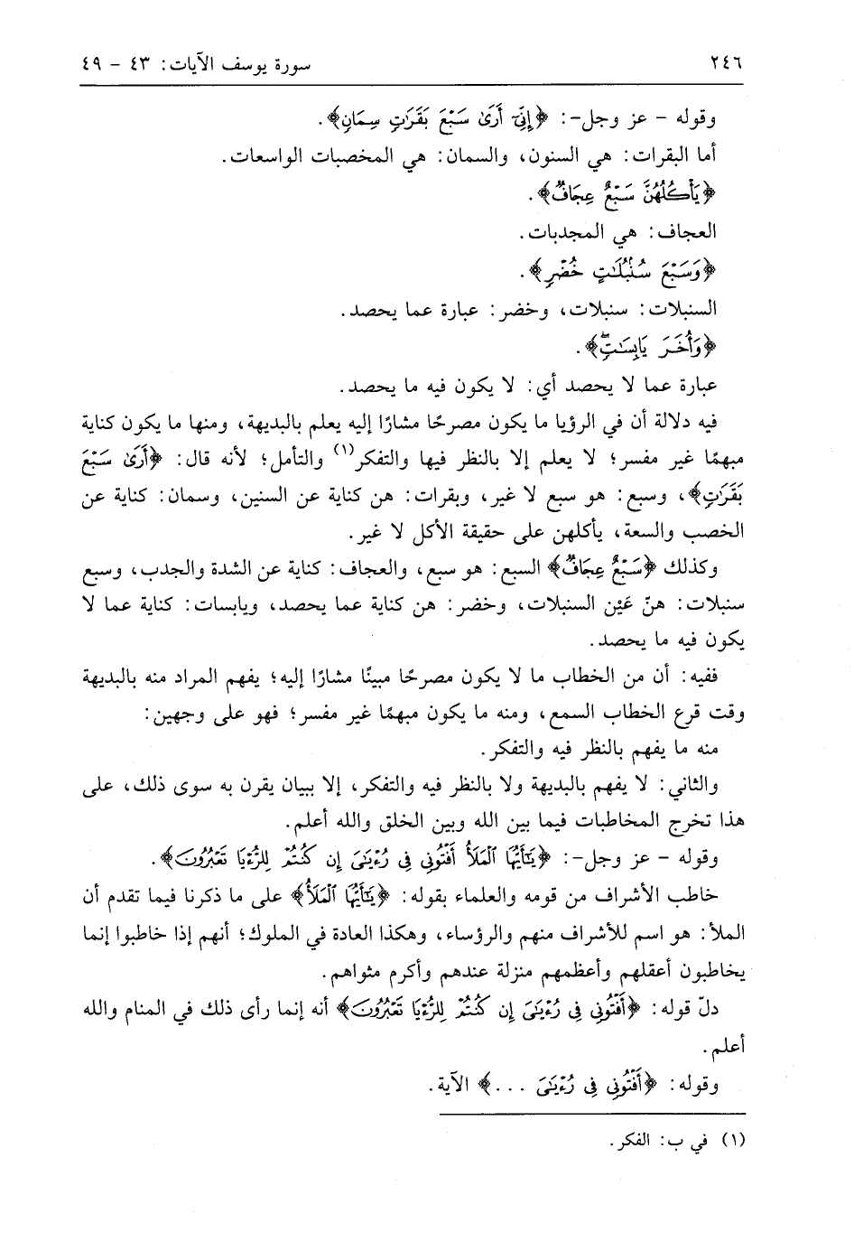فيه دلالة أن في الرؤيا ما يكون مصرحًا مشارًا إليه يعلم بالبديهة، ومنها ما يكون كناية مبهمًا غير مفسر؛ لا يعلم إلا بالنظر فيها والتفكر والتأمل؛ لأنه قال: (أَرَى سَبْعَ بَقَرَاتٍ)، وسبع: هو سبع لا غير، وبقرات: هن كناية عن السنين، وسمان: كناية عن الخصب والسعة، يأكلهن على حقيقة الأكل لا غير.