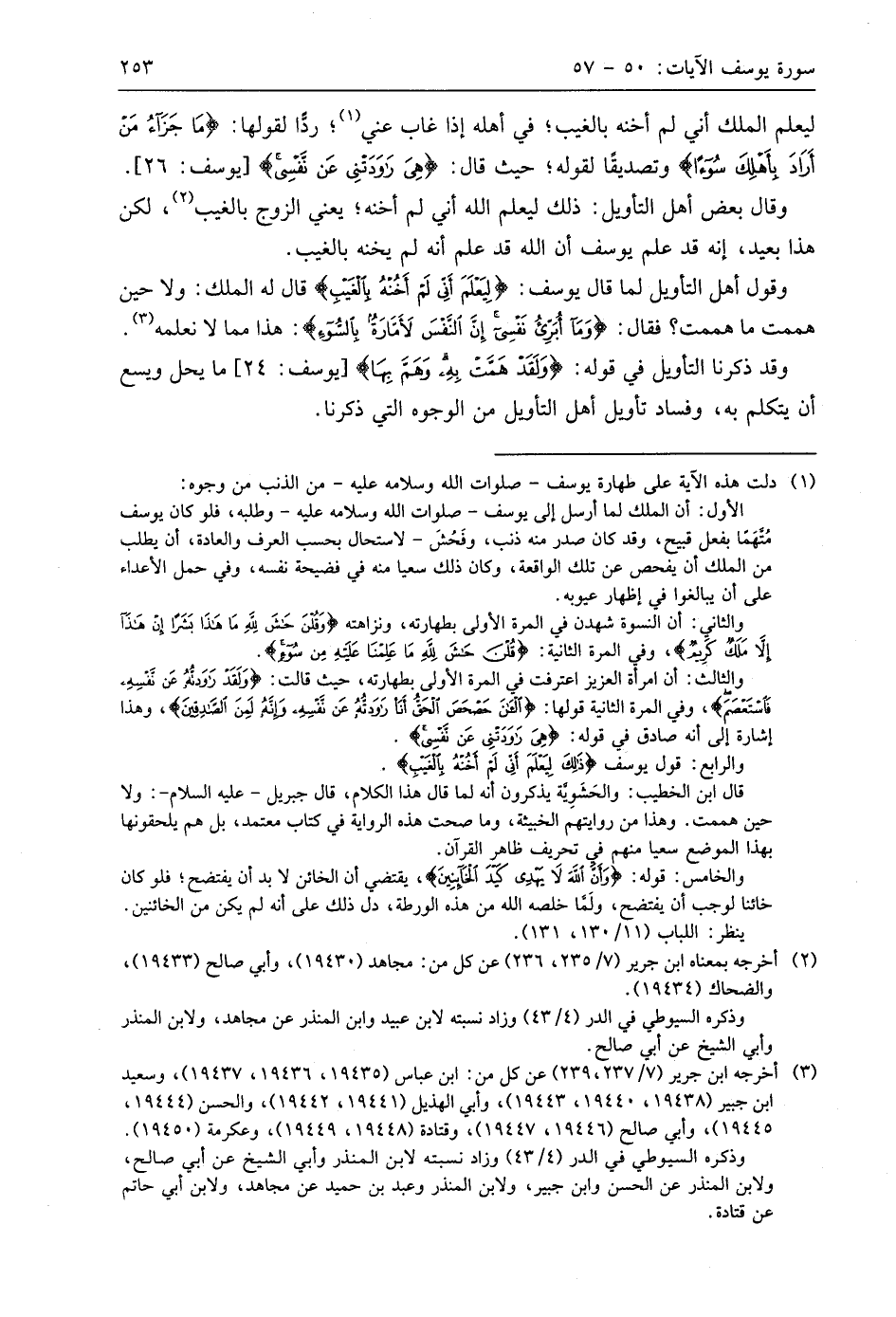 وقول أهل التأويل لما قال يوسف: (لِيَعْلَمَ أَنِّي لَمْ أَخُنْهُ بِالْغَيْبِ) قال له الملَك: ولا حين هممت ما هممت؟ فقال: (وَمَا أُبَرِّئُ نَفْسِي إِنَّ النَّفْسَ لَأَمَّارَةٌ بِالسُّوءِ): هذا مما لا نعلمه.