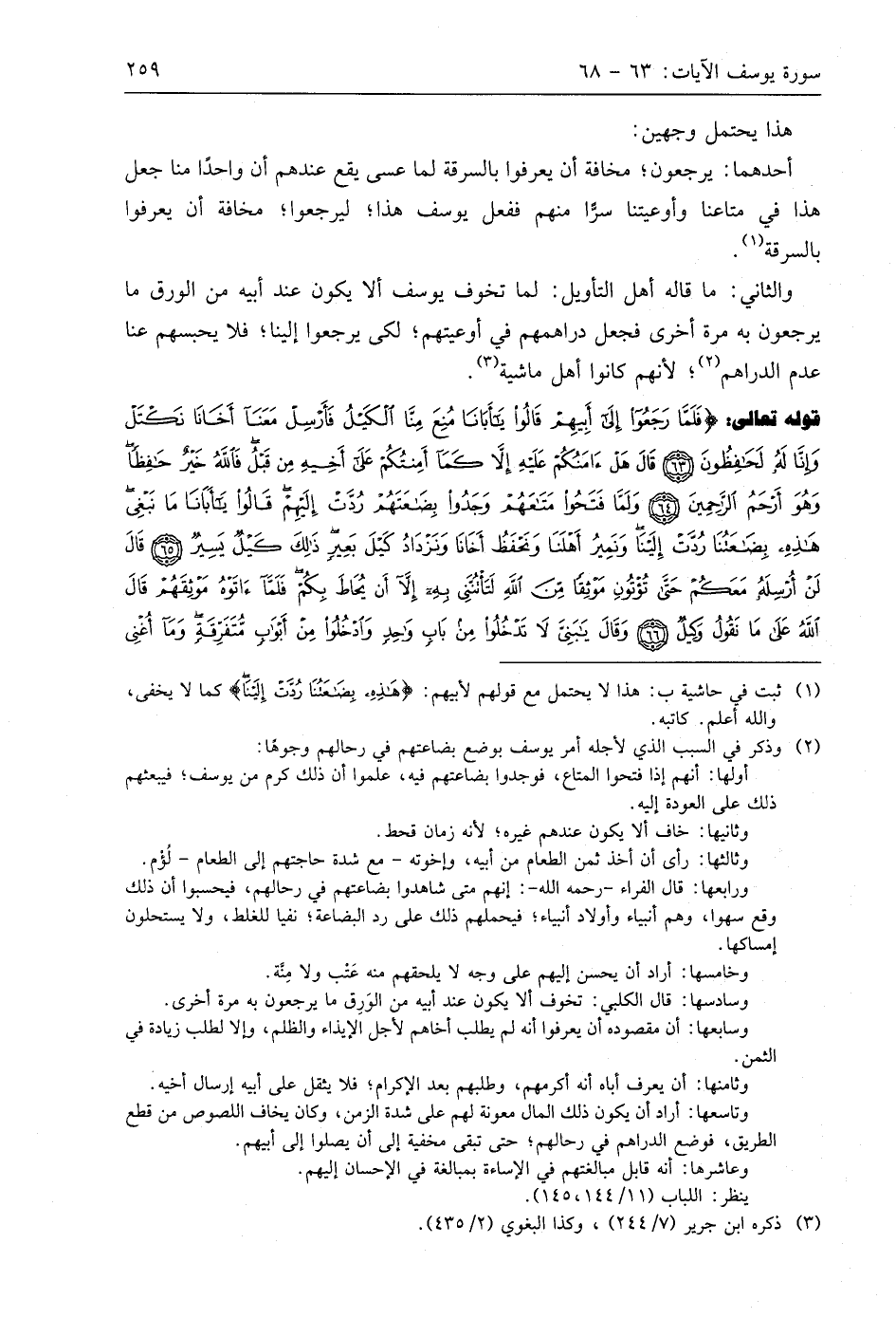 أحدهما: يرجعون؛ مخافة أن يعرفوا بالسرقة لما عسى يقع عندهم أن واحدًا منا جعل هذا في متاعنا وأوعيتنا سرًّا منهم ففعل يوسف هذا؛ ليرجعوا؛ مخافة أن يعرفوا بالسرقة.