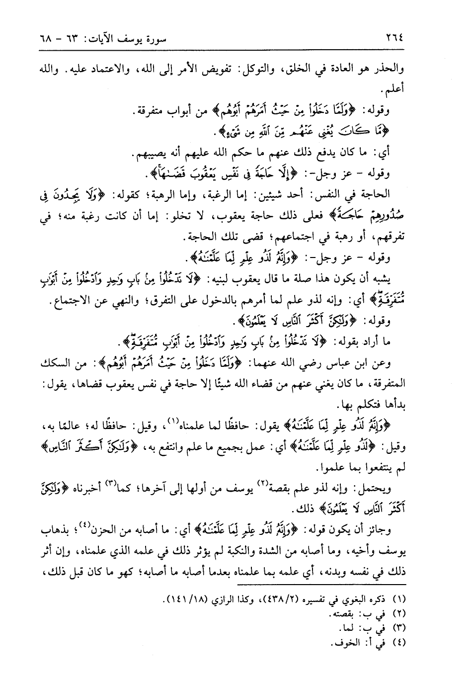 يشبه أن يكون هذا صلة ما قال يعقوب لبنيه: (لَا تَدْخُلُوا مِنْ بَابٍ وَاحِدٍ وَادْخُلُوا مِنْ أَبْوَابٍ مُتَفَرِّقَةٍ) أي: وإنه لذو علم لما أمرهم بالدخول على التفرق؛ والنهي عن الاجتماع.