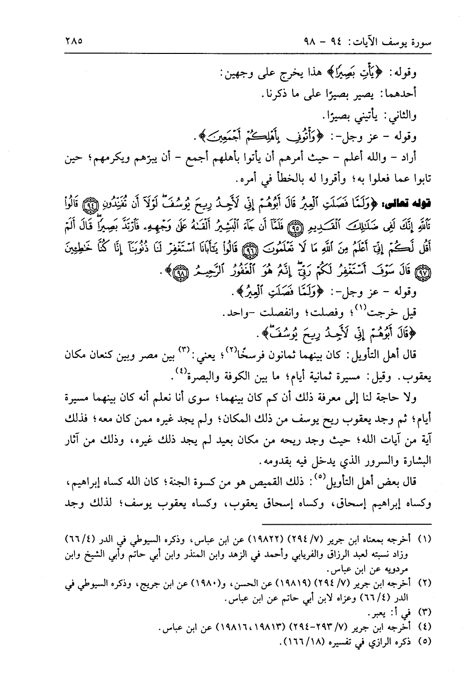 ولا حاجة لنا إلى معرفة ذلك أن كم كان بينهما؛ سوى أنا نعلم أنه كان بينهما مسيرة أيام؛ ثم وجد يعقوب ريح يوسف من ذلك المكان؛ ولم يجد غيره ممن كان معه؛ فذلك آية من آيات اللَّه؛ حيث وجد ريحه من مكان بعيد لم يجد ذلك غيره، وذلك من آثار البشارة والسرور الذي يدخل فيه بقدومه.