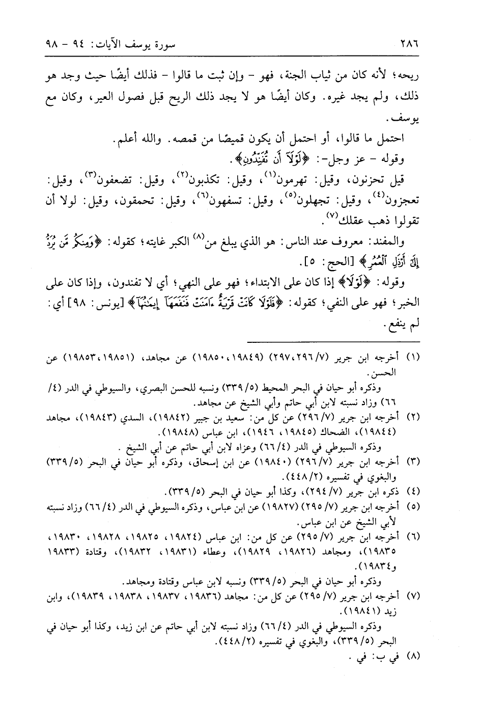 قيل تحزنون، وقيل: تهرمون، وقيل: تكذبون، وقيل: تضعفون، وقيل: تعجزون، وقيل: تجهلون، وقيل: تسفهون، وقيل: تحمقون، وقيل: لولا أن تقولوا ذهب عقلك.