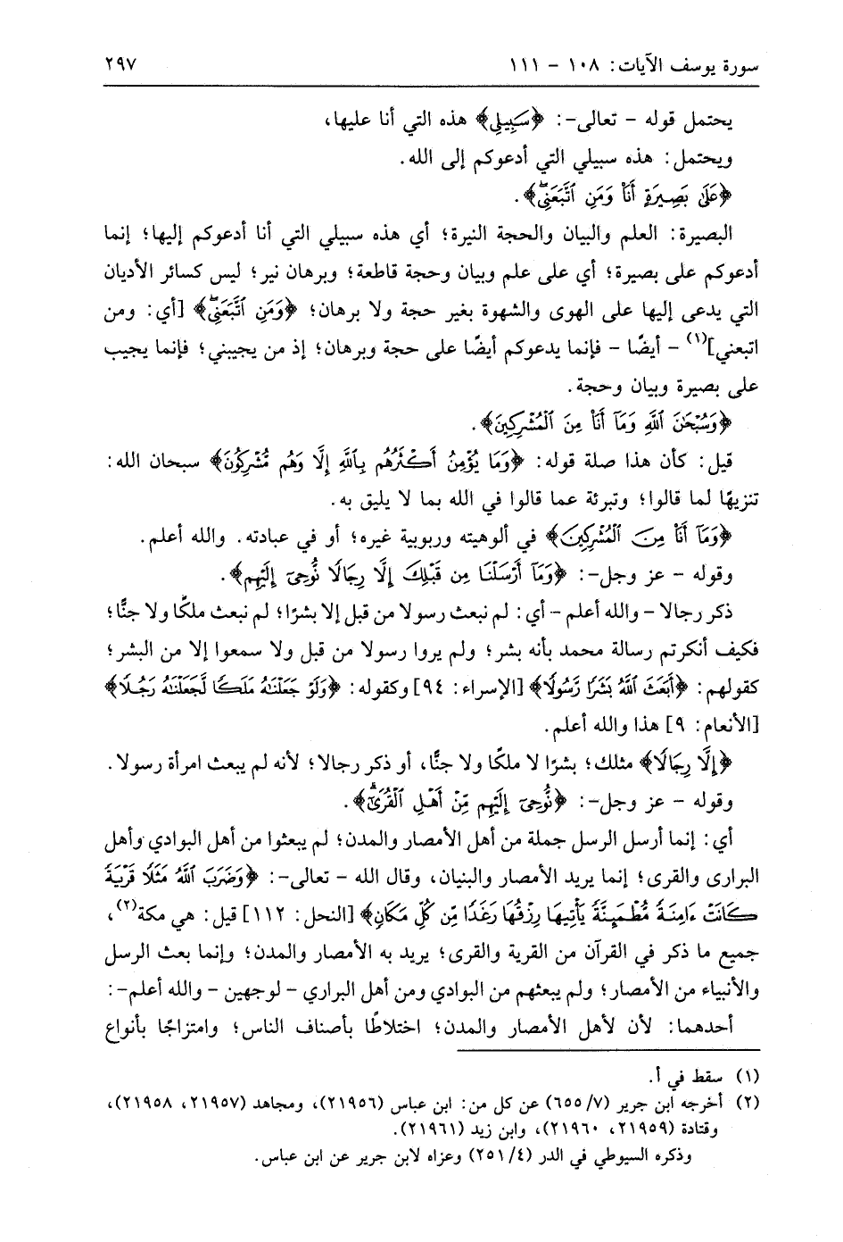 البصيرة: العلم والبيان والحجة النيرة؛ أي هذه سبيلي التي أنا أدعوكم إليها؛ إنما أدعوكم على بصيرة؛ أي على علم وبيان وحجة قاطعة؛ وبرهان نير؛ ليس كسائر الأديان التي يدعى إليها على الهوى والشهوة بغير حجة ولا برهان؛ (وَمَنِ اتَّبَعَنِي) أي: ومن اتبعني، -أيضًا- فإنما يدعوكم أيضًا على حجة وبرهان؛ إذ من يجيبني؛ فإنما يجيب على بصيرة وبيان وحجة.